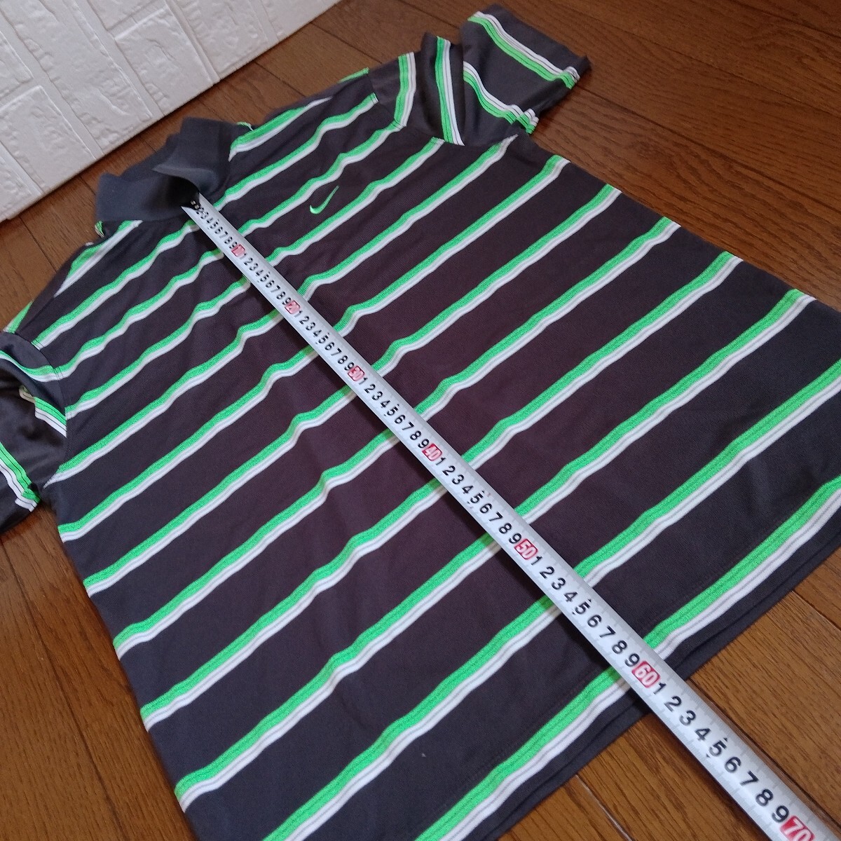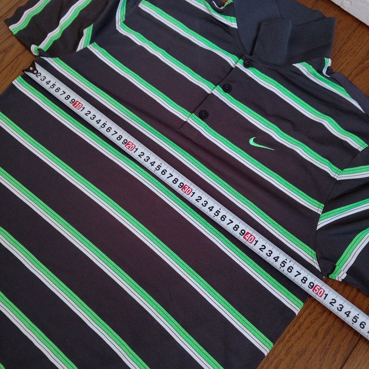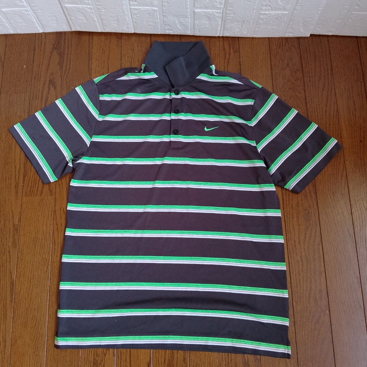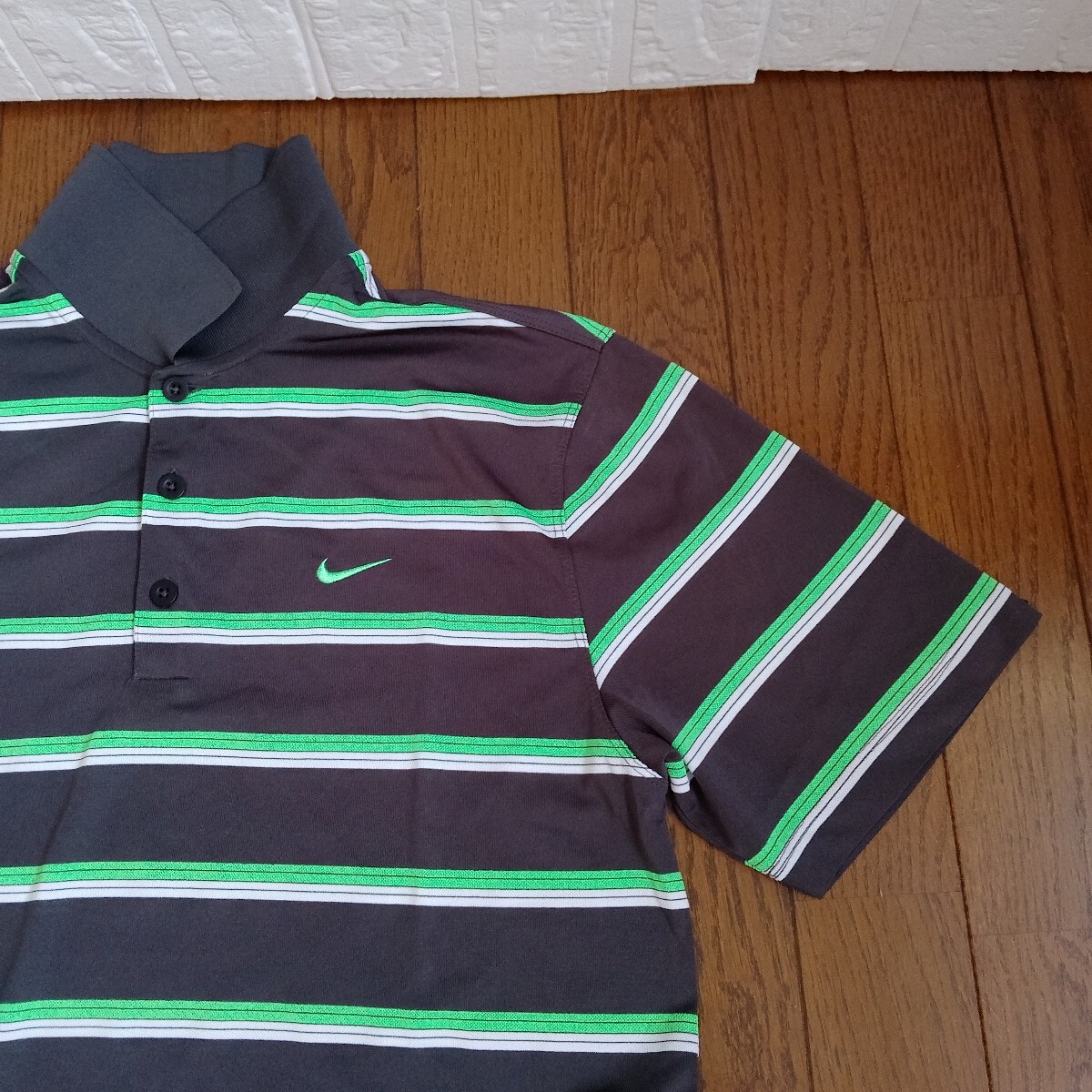 NIKE Dri-FIT メンズ半袖ポロシャツです。色はダークグレーと白、緑のボーダー柄です。前ボタン3つ、左胸に『NIKE』の光沢のあるロゴ刺繍でDRI-FITです、