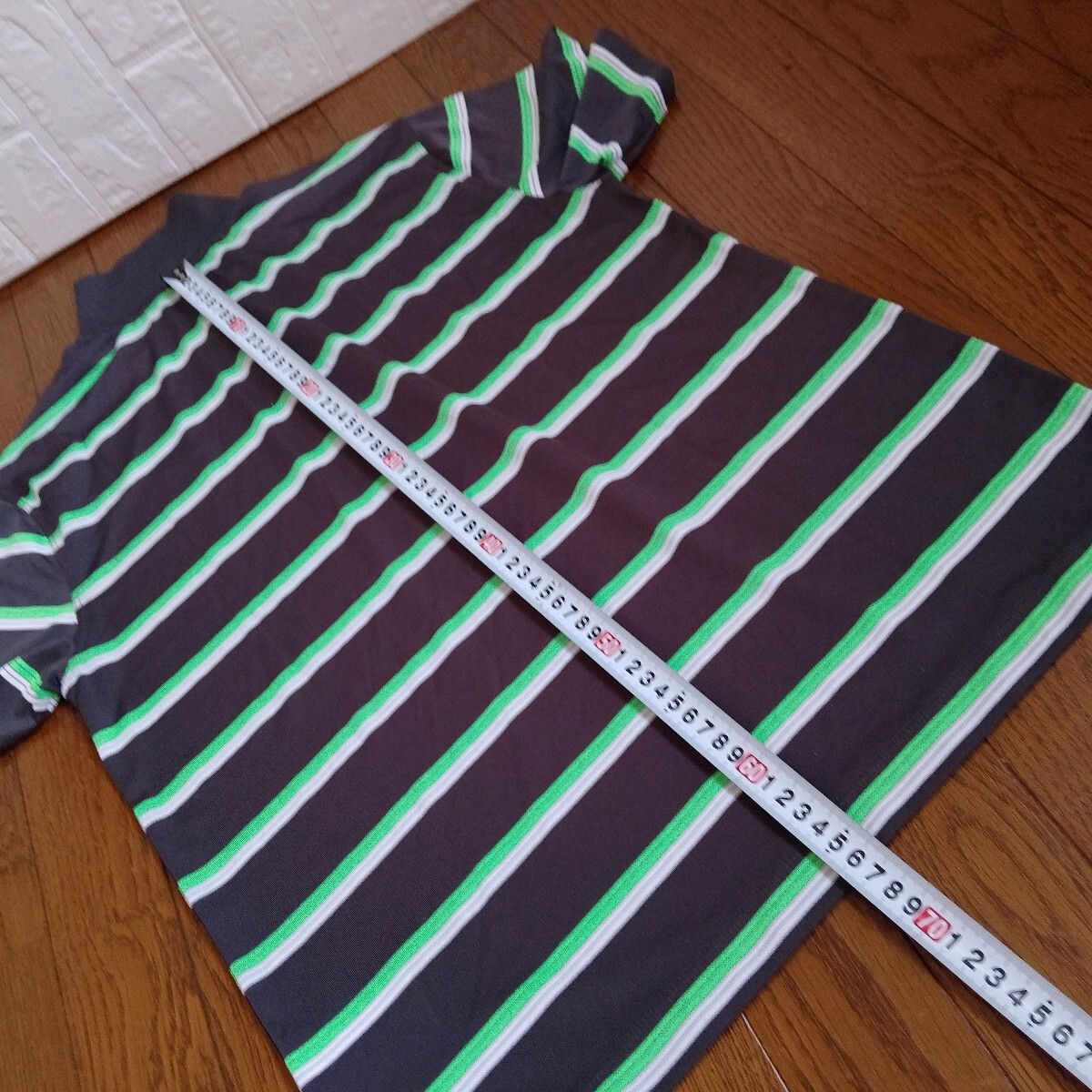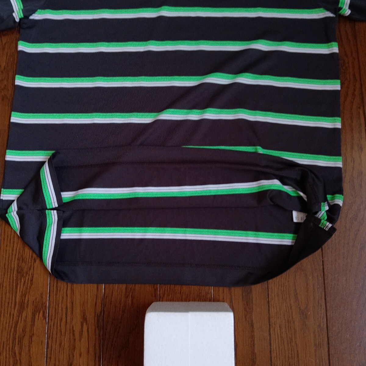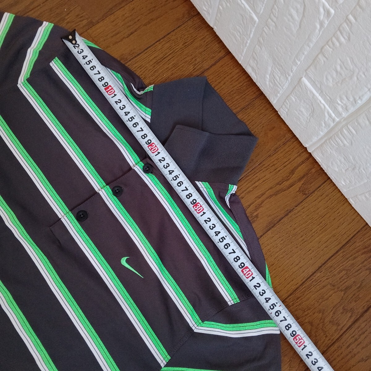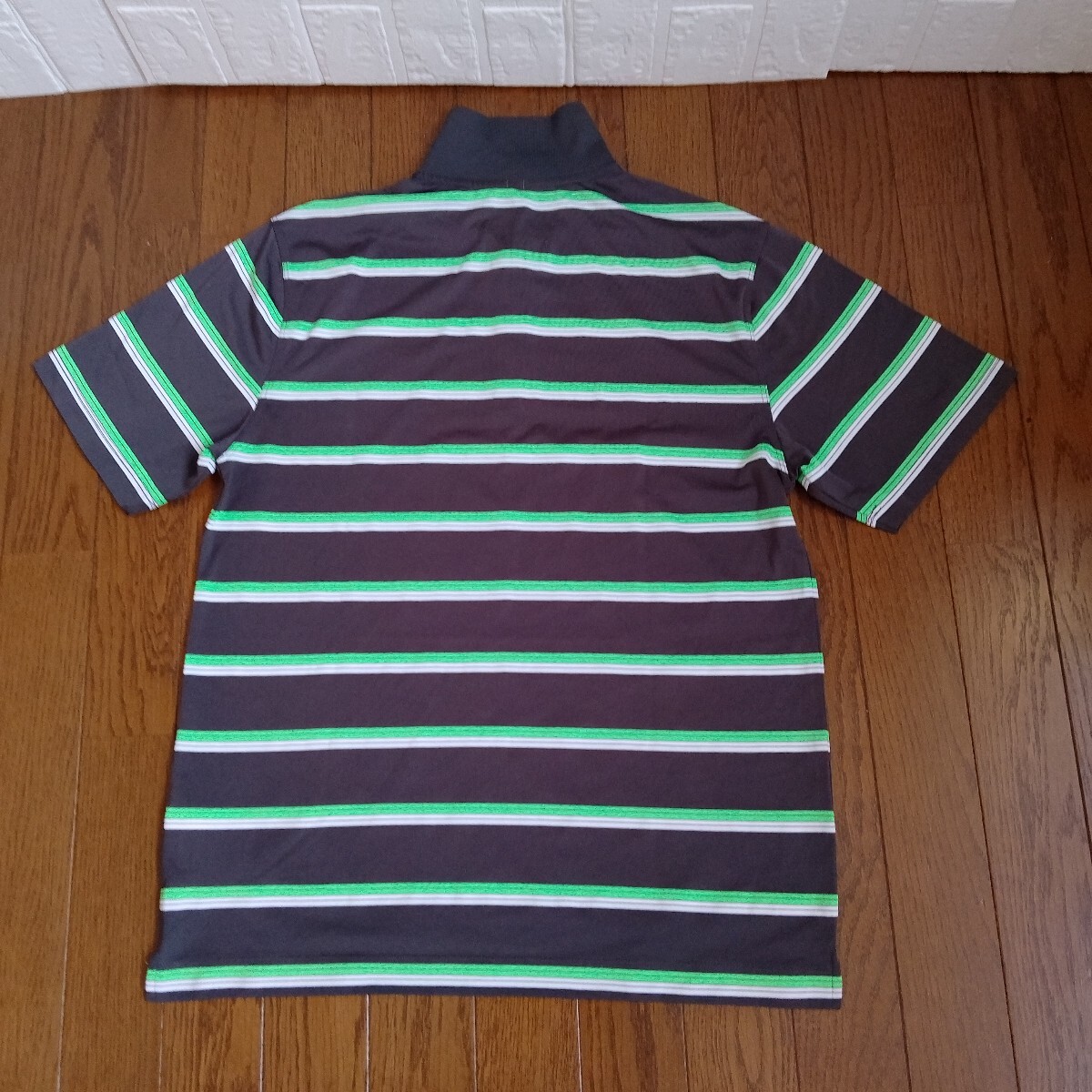NIKE Dri-FIT メンズ半袖ポロシャツです。色はダークグレーと白、緑のボーダー柄です。前ボタン3つ、左胸に『NIKE』の光沢のあるロゴ刺繍でDRI-FITです、