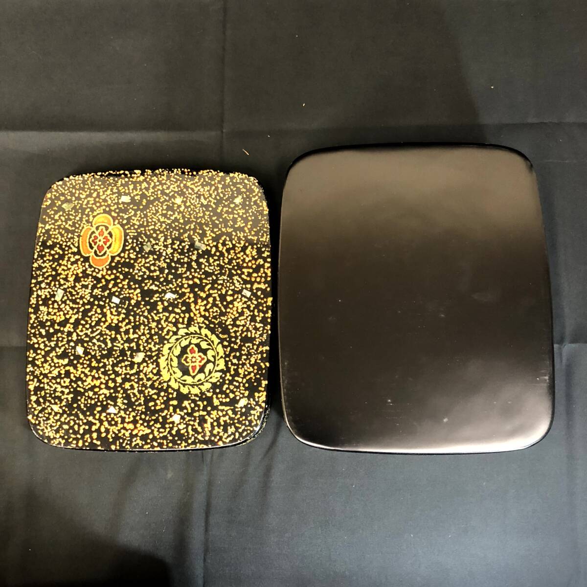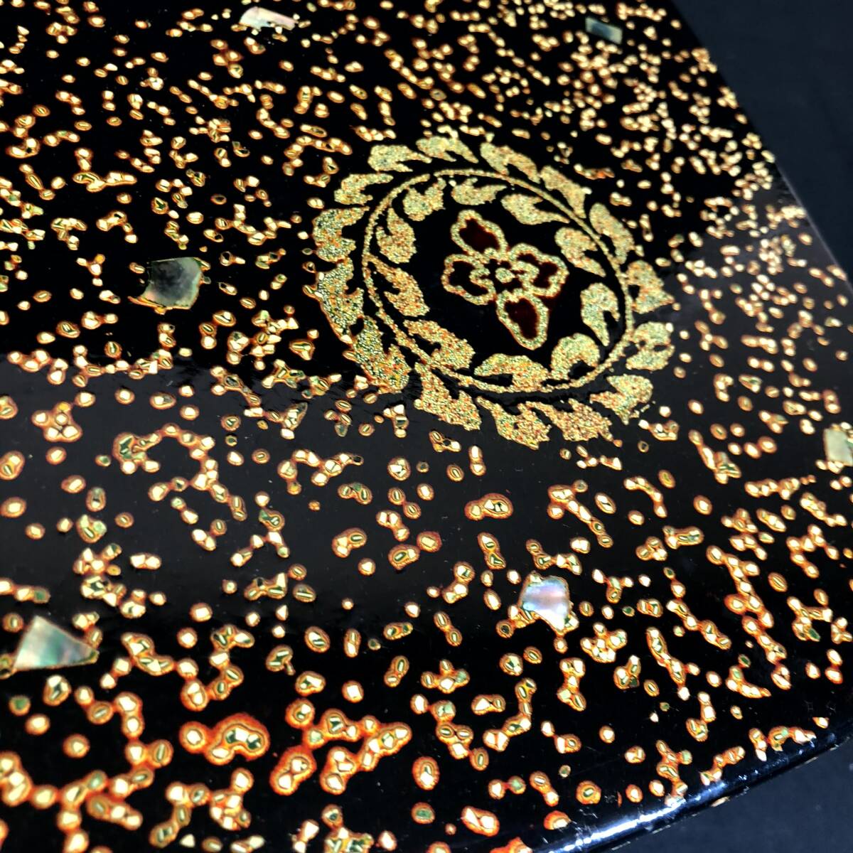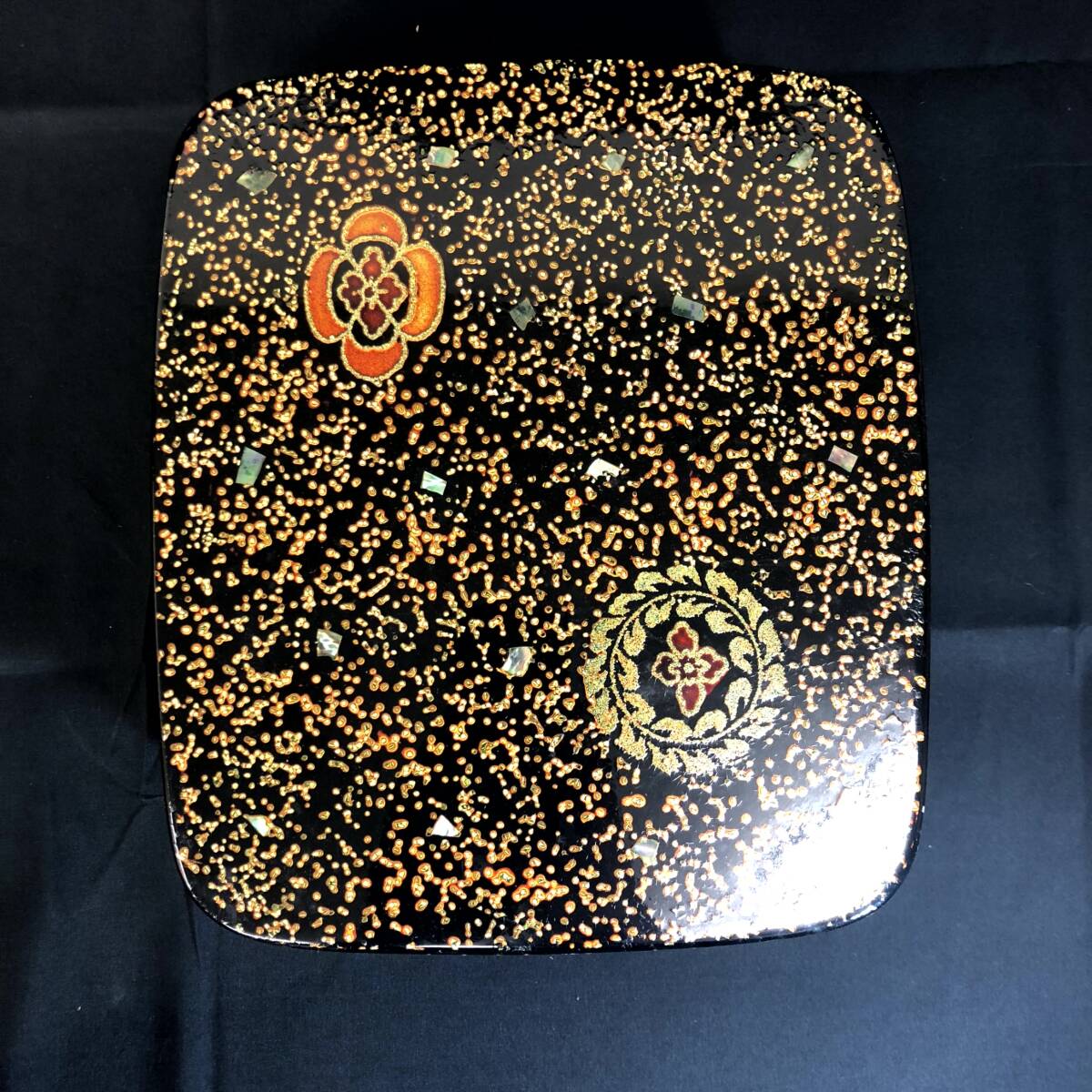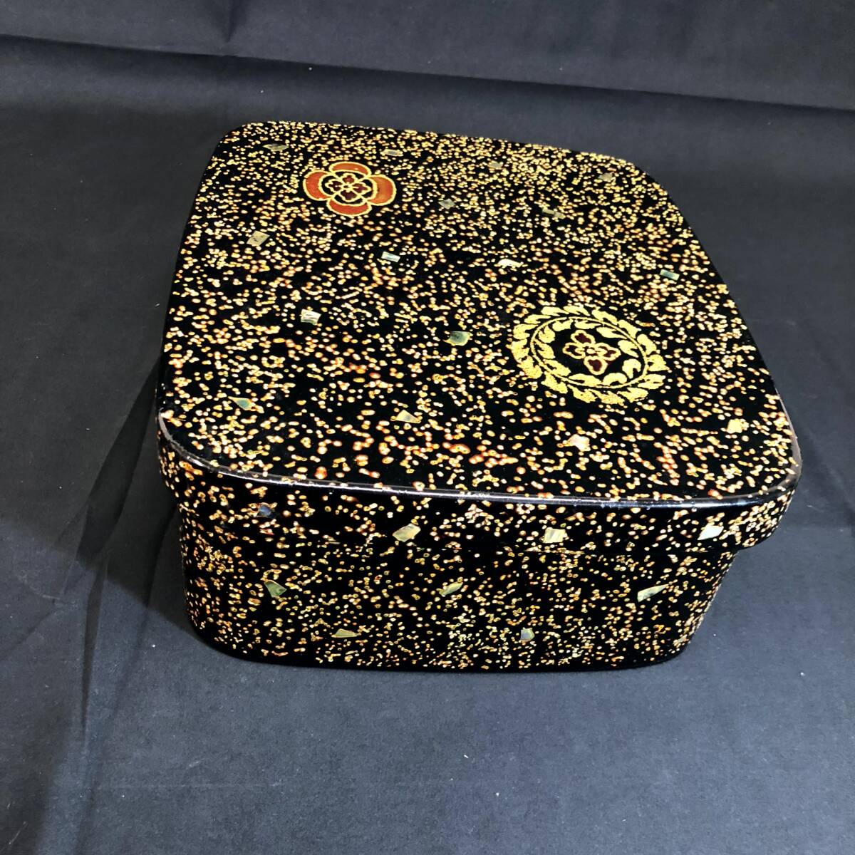 こちらは、黒塗りに金彩と蒔絵装飾が美しく施された重箱です。