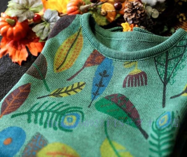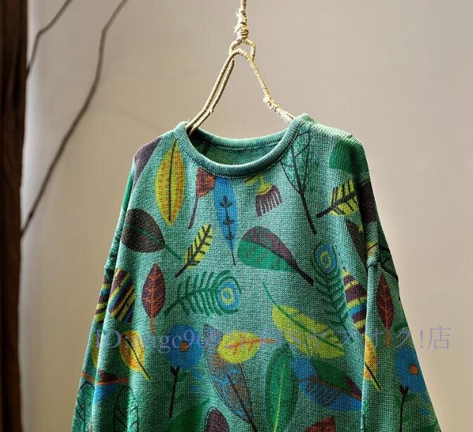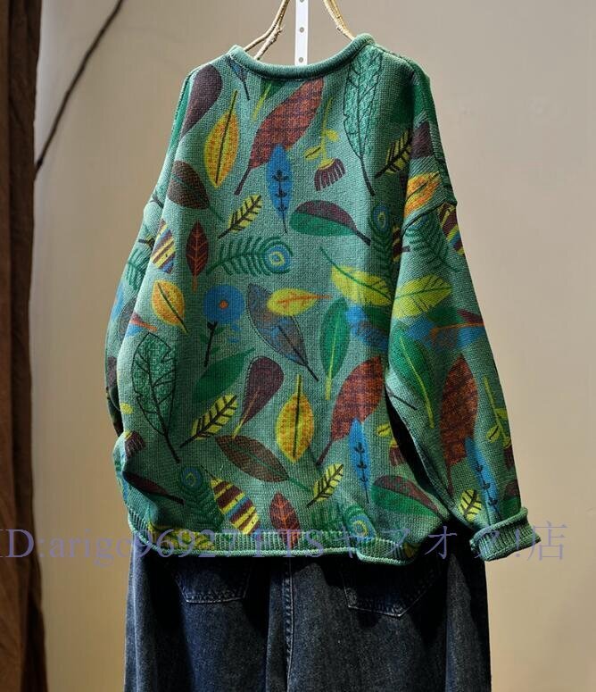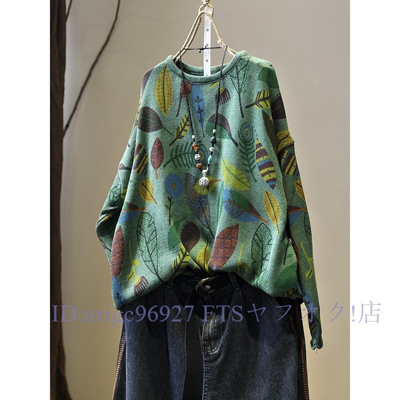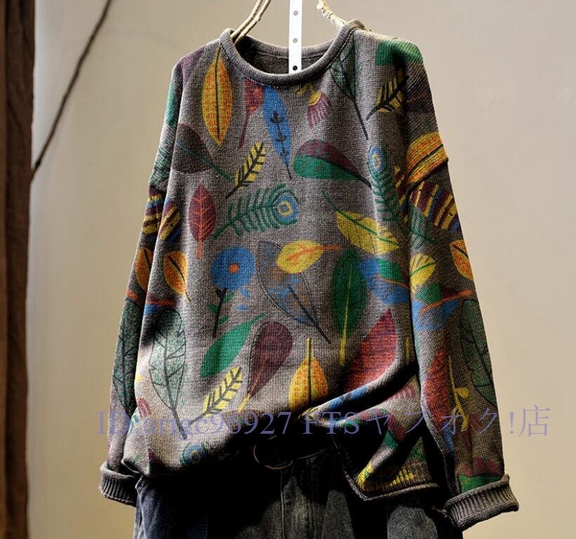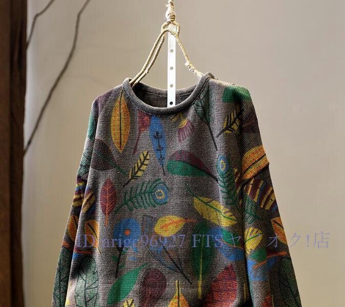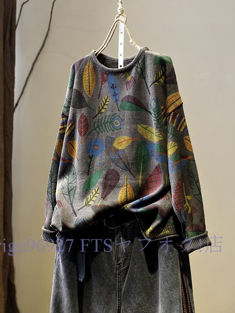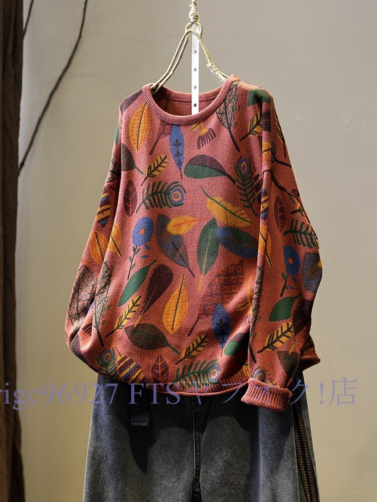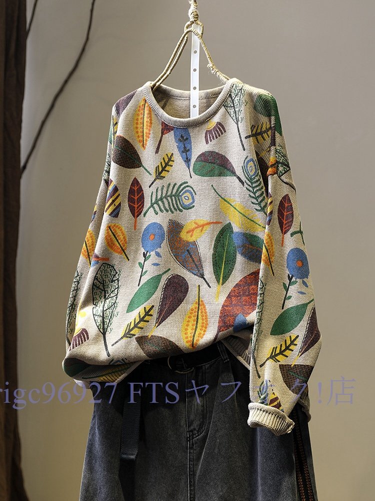 ★新品ニット セーター ゆったり トップス チュニック フリーサイズ ナチュラル風 プリント葉っぱ柄4 綿100% コットン クールネック茶色