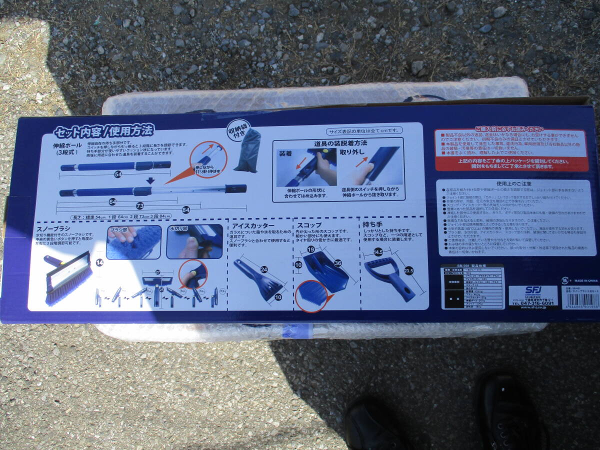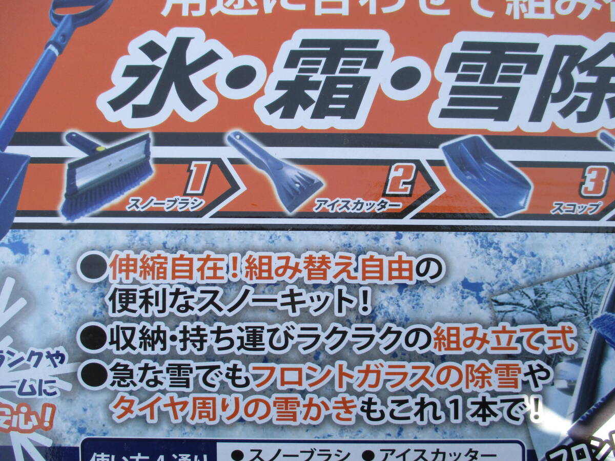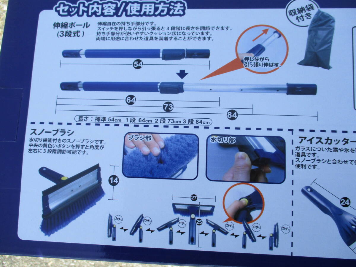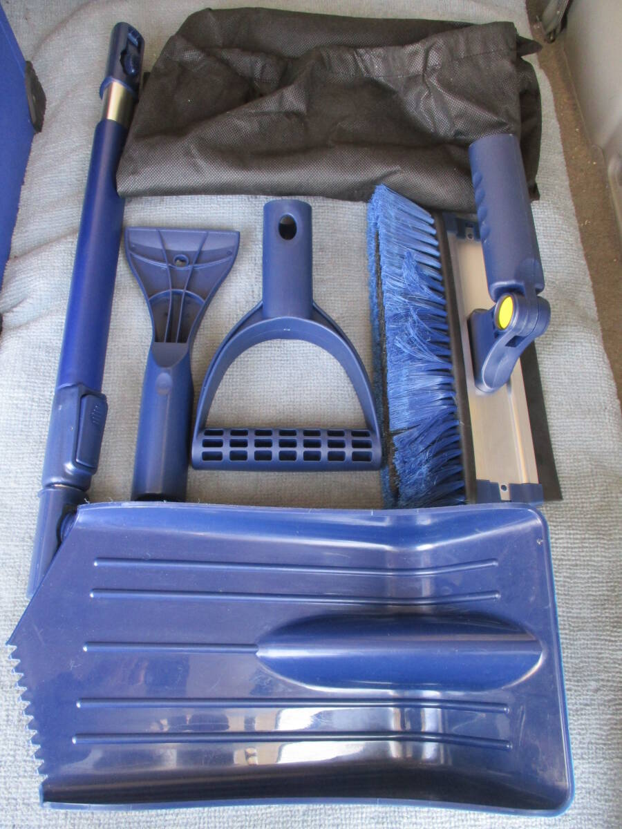 便利なスノーブラシ、スコップ、アイスカッター、持手、伸縮ポール、収納袋のセットになります。