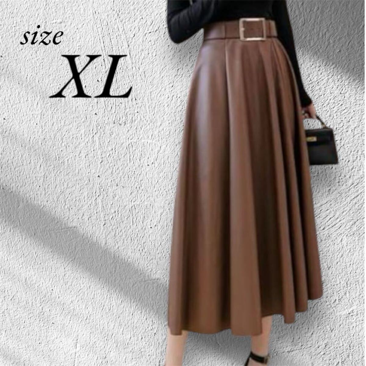 レザー スカート ブラウン XL Aライン ミモレ丈 ベルト付き