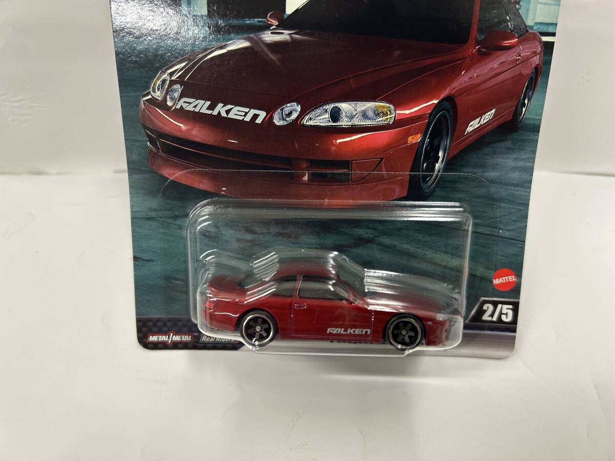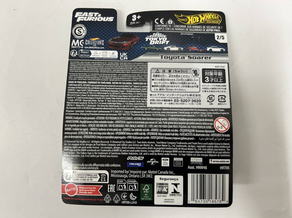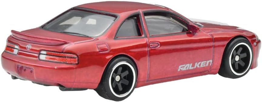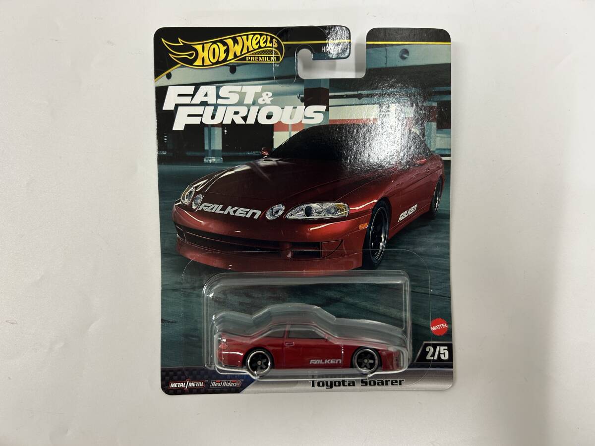 ホットウィール(Hot Wheels) ワイルド・スピード - トヨタ ソアラ 映画『ワイルド・スピード』シリーズの第3作、『ワイルド・スピードX3 TOKYO DRIFT』の立体駐車場のシーンでチラリと映る個体がモチーフとなった1台。 劇中車同様に、レッドメタリックのボディにタイヤメーカー「FALKEN」の白いロゴが映える。 車高を低く下げ、前後スポイラーを装着したカスタム仕様となっている。 ソアラは1981年に初代が登場した日本の高級パーソナルクーペの先駆けで、ホットウィールが題材としたモデルはその3代目で1991年から2001年まで生産された。この世代からアメリカでも販売され、レクサス SCを名乗った。 |