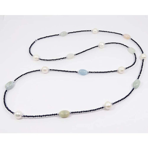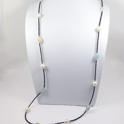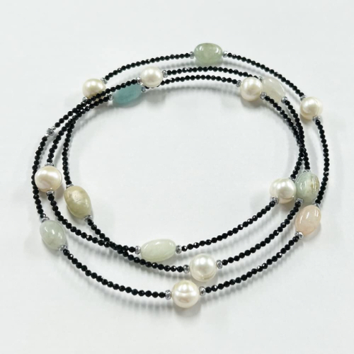 漆黒の輝きが繊細な煌めきを放つブラックスピネルをベースに、マルチカラーのモルガナイトと大粒の真珠でステーションネックレスにデザインしてます。