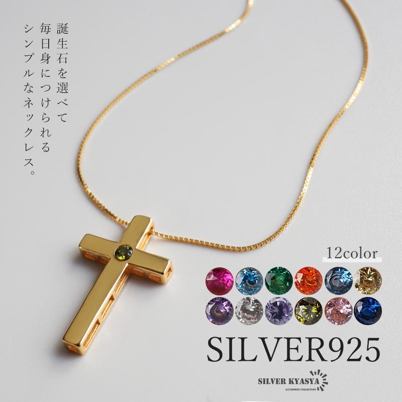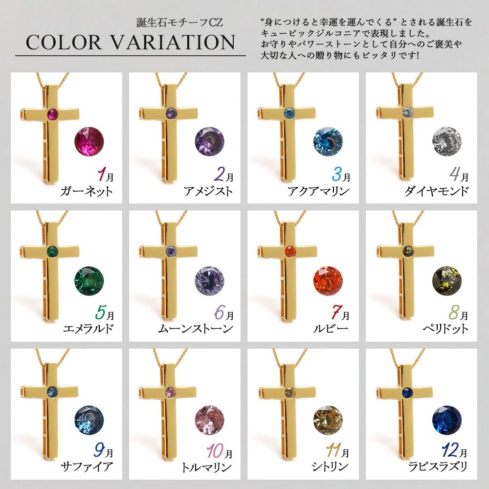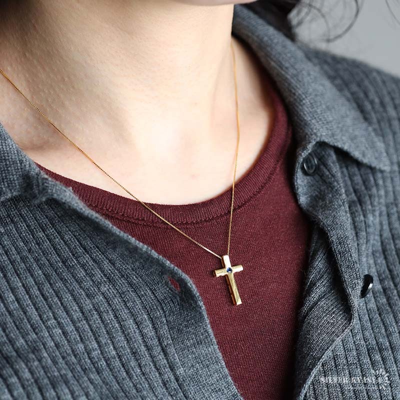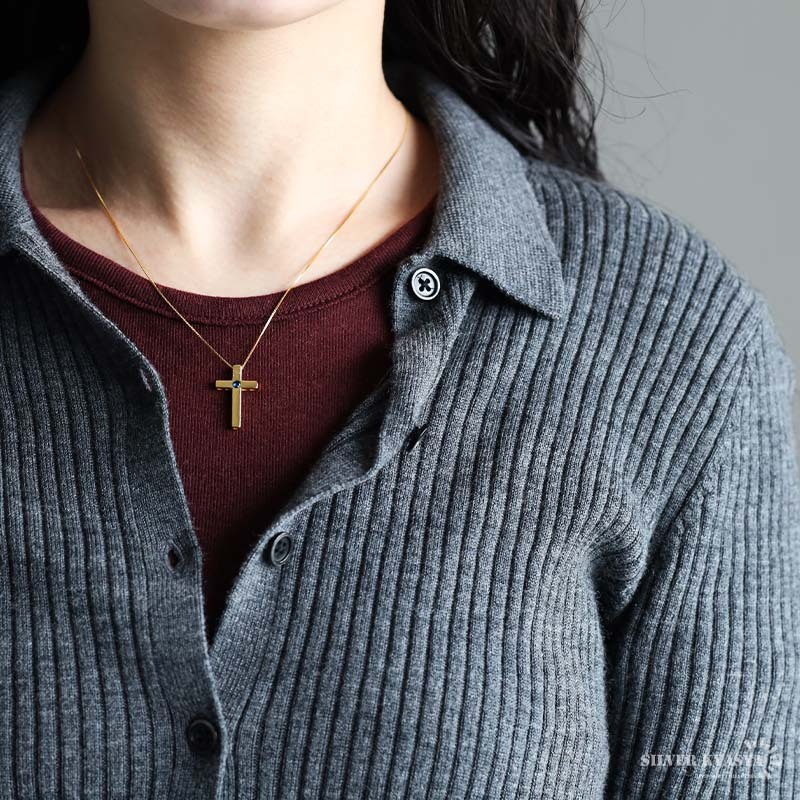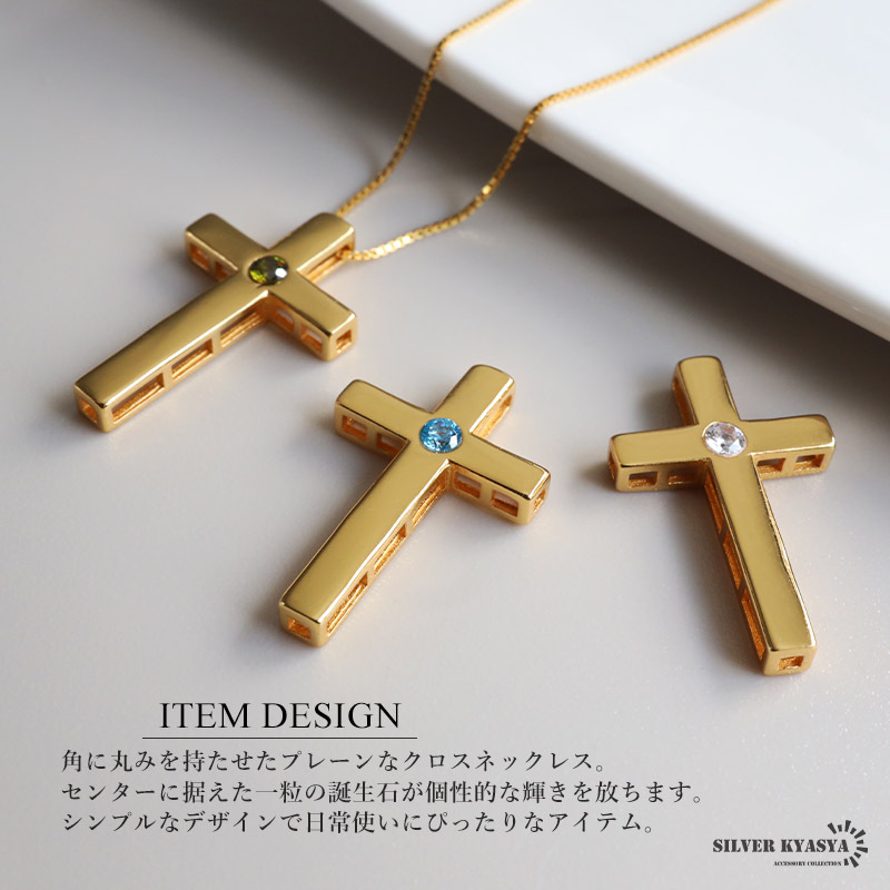 角に丸みを持たせたプレーンなクロスネックレス。センターに据えた一粒の誕生石が個性的な輝きを放ちます。シンプルなデザインで日常使いにぴったりなアイテム。