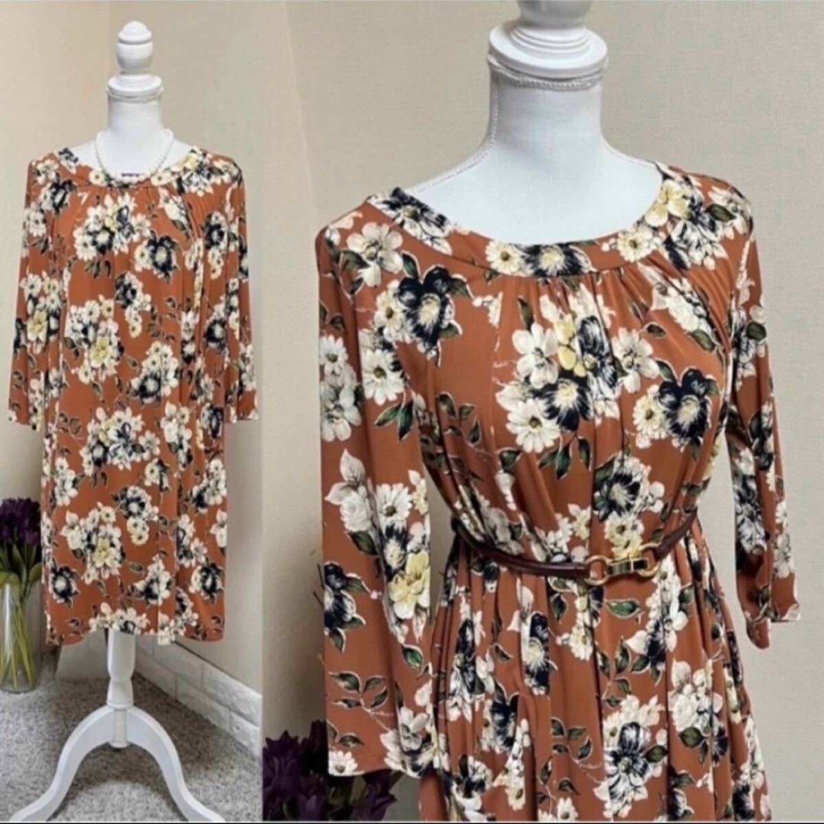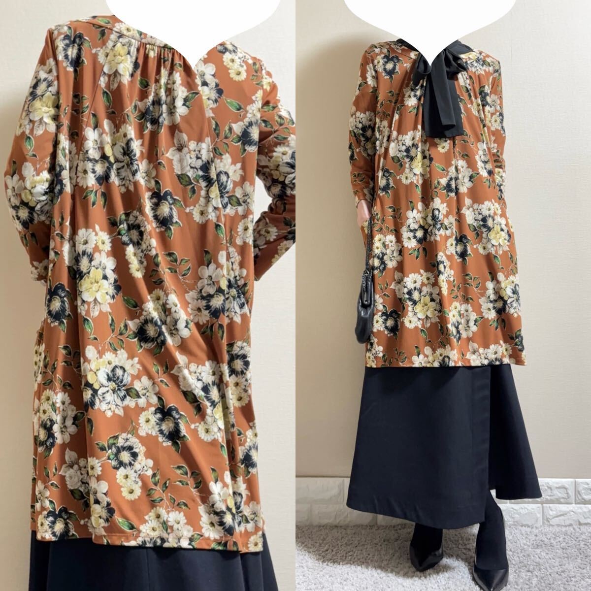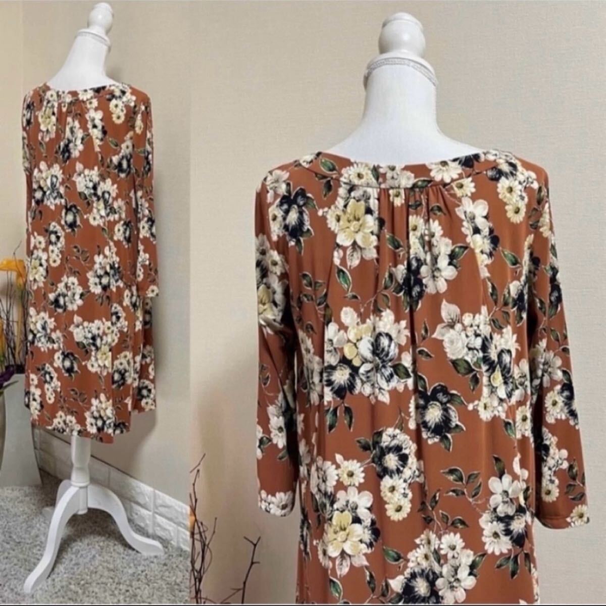 ふんわり優しい印象の花柄 ストレッチジャージー 7〜8分袖丈 チュニック ワンピース です