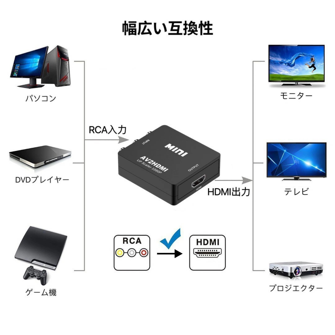 RCA(3色ケーブル)をHDMIに変換するためのアダプタです。ドライバのインストールなど手間のかかる作業は一切不要です。AV出力対応のゲーム機、カメラ、VCR/STB/DVD/Blue-RayプレイヤーをHDMI対応のモニターやテレビやプロジェクターに接続できます。