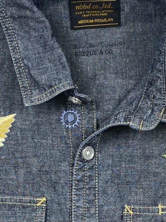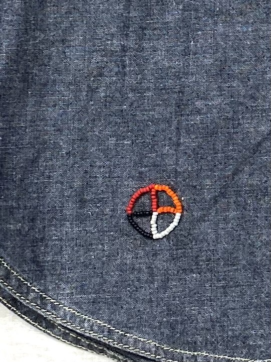 左右の胸に刺繍、すそにビーズ刺繍を施したシャンブレー生地を使用した長袖シャツです。
