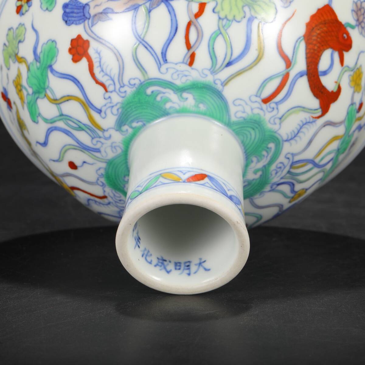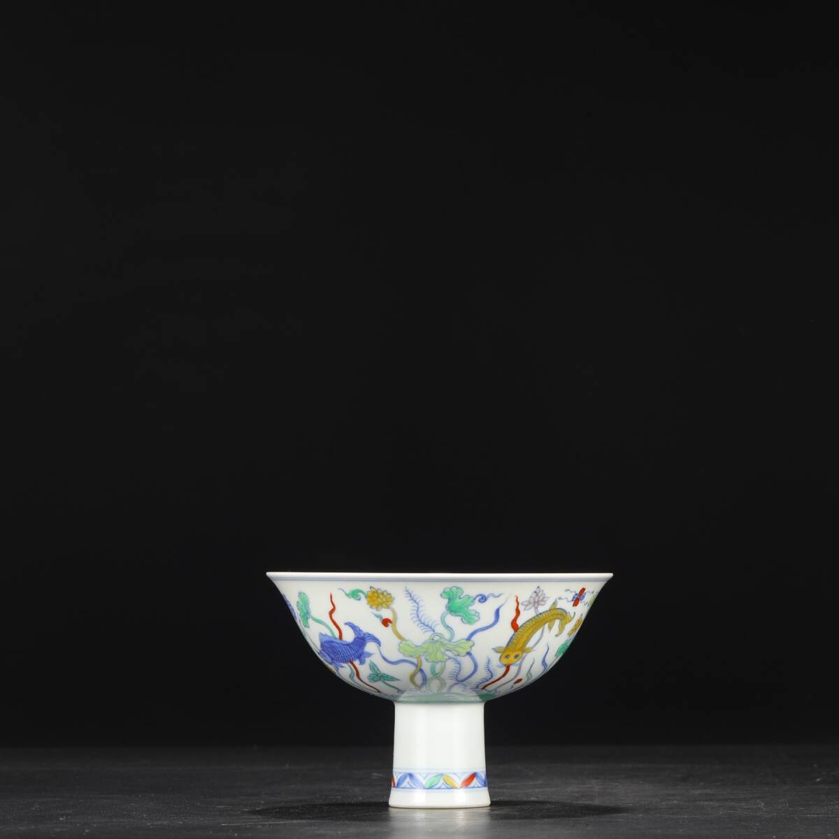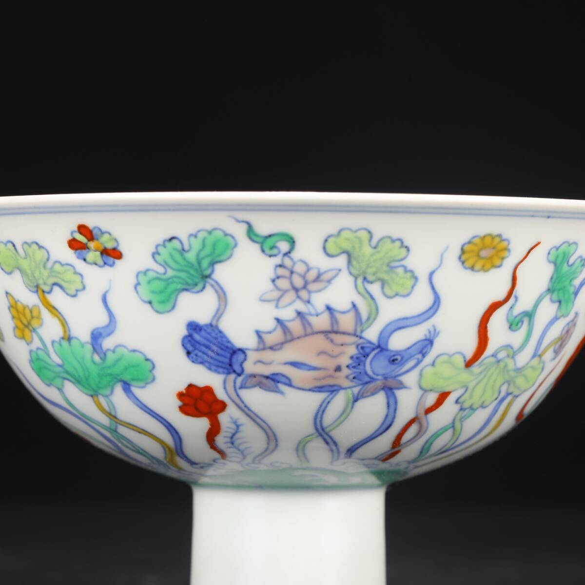 明時代 時代 成化斗彩魚藻文高足碗 唐物 箱付き 陶磁器 中国美術 古美術 置物 高さ10.5cm 口径15.5cm RG651