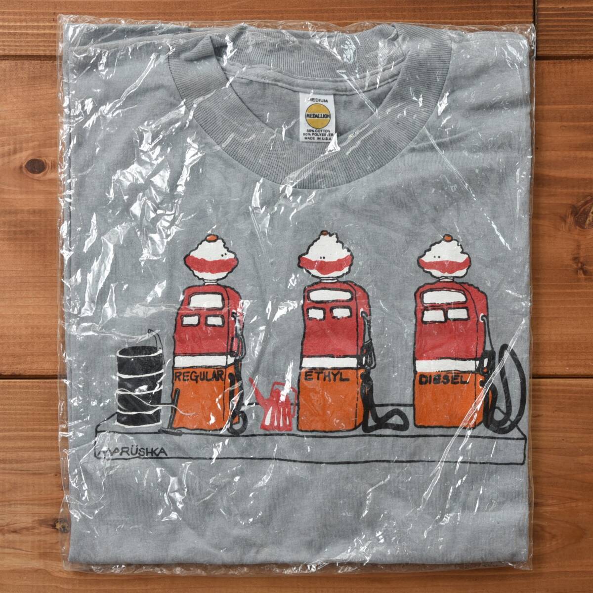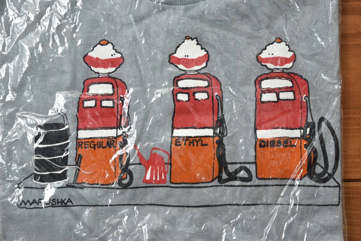 こちらのTシャツはタグから80年代のものと思われ、ラバーインクのシルクスクリーンによるMarushkaらしいガソリンスタンドが描かれています。