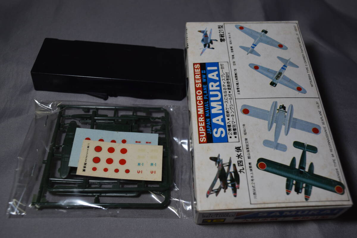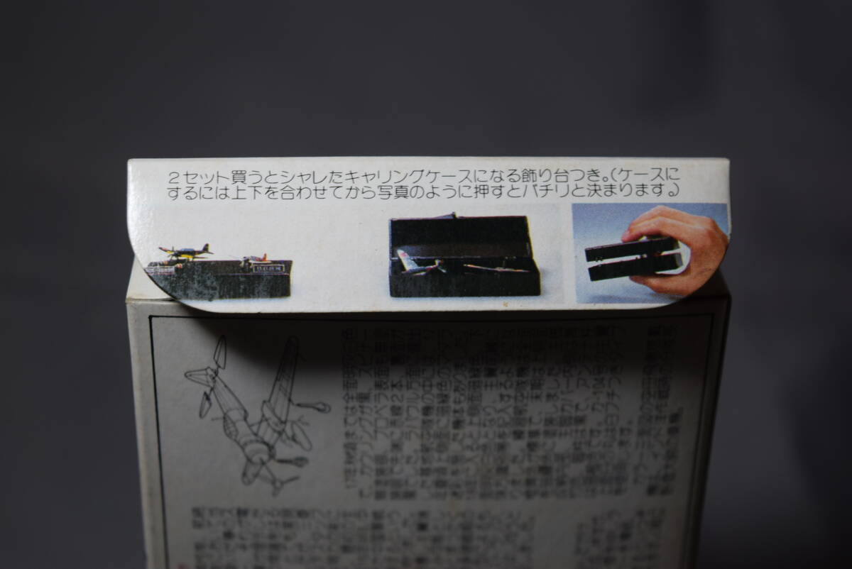 参考として九四水偵と零戦二一型のクローズアップ写真を載せましたが、この極小スケールで筋彫りがあり、デカールには部隊マークや機番まで網羅、箱裏の説明には改造例(二重反転ペラの強風試作機とか!)まで出ていて、年少者が買う駄菓子屋キットにも魂を込めたニチモの本気が伝わります(2個で一つになるキャリングケース兼展示台も楽しい)。