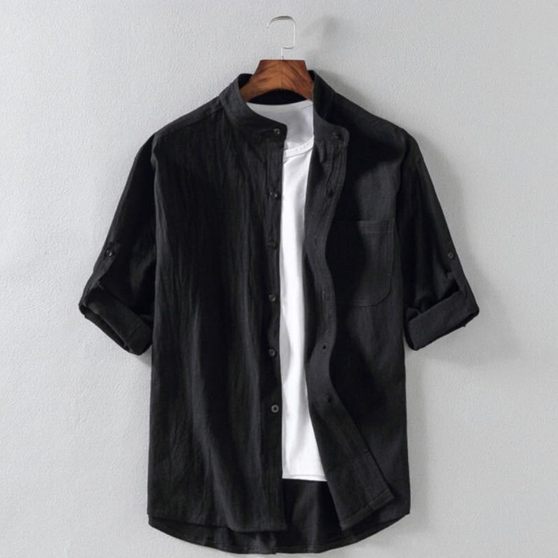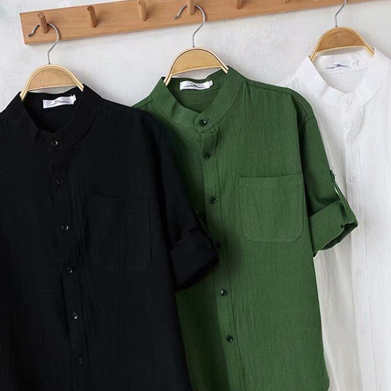 新品メンズシャツ 7分丈袖 トップス カジュアルシャツ 開襟シャツ 麻綿風 スタンドカラーシャツゆったりサマーシャツ無地夏服 ブラック 4XL