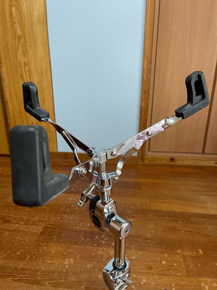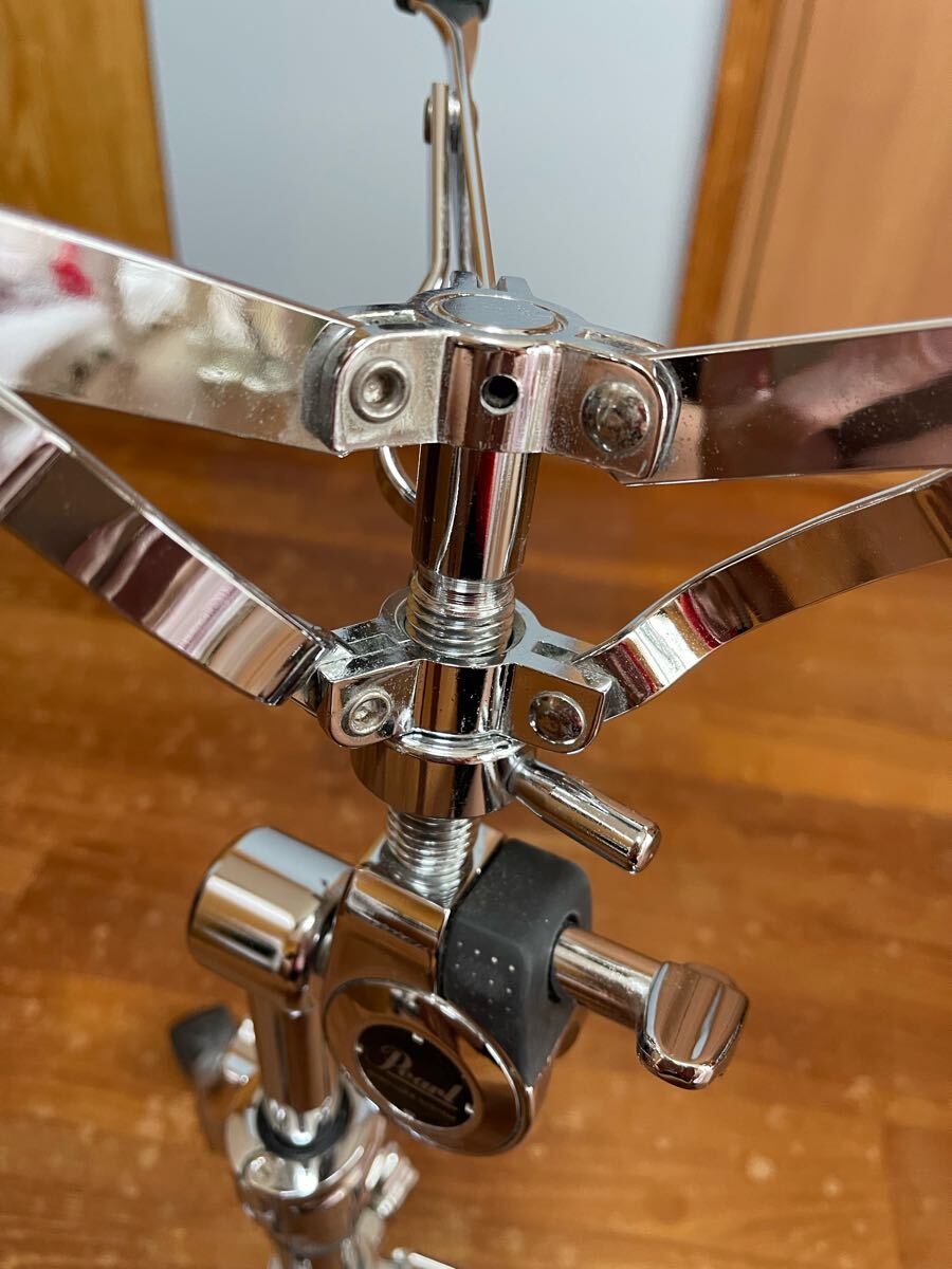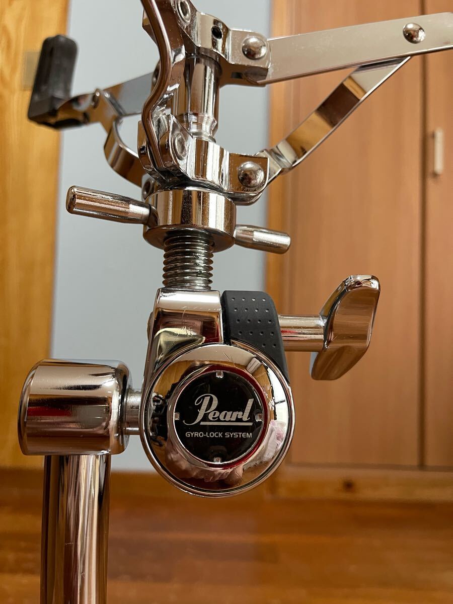 10年以上前に購入したパールのスネアスタンドです。ジャイロロックシステム採用のモデルなので自由にセッティングできます。大切に使用してきたので大きな破損はなく今でも問題なく使用できます。ただし10年以上経つので経年劣化によるビスのサビや汚れがありますが状態がよく光沢が保たれています。
