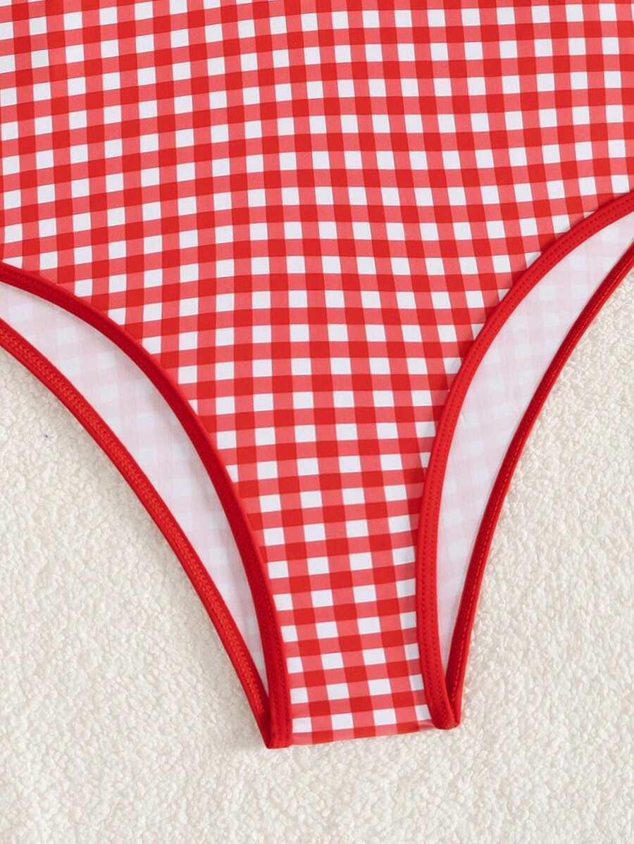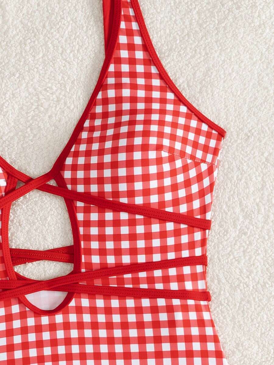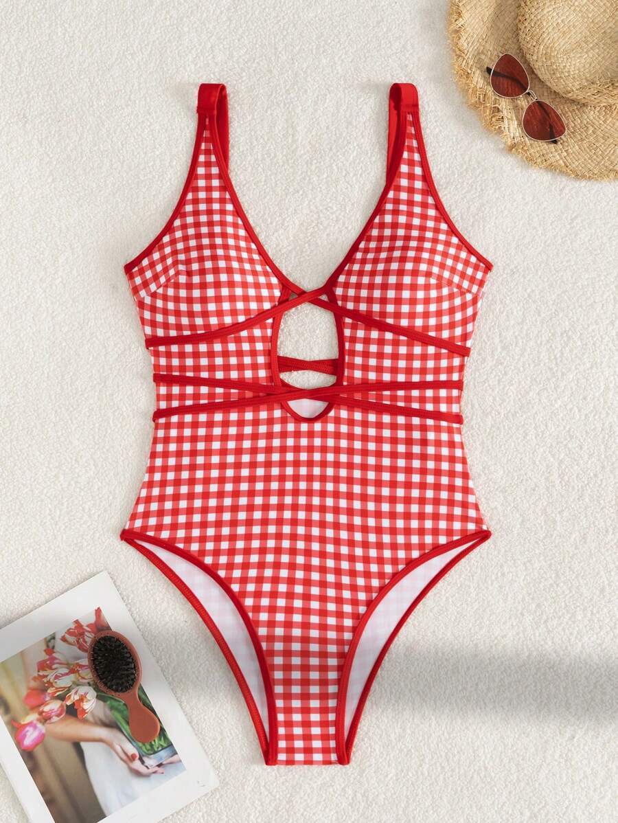 レディース 水着 ワンピース 女性用 ネック チェック柄 リボン付きホールアウトワンピース水着、夏のビーチバケーション用