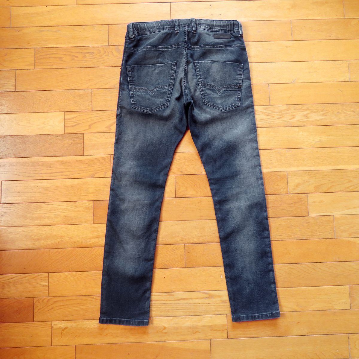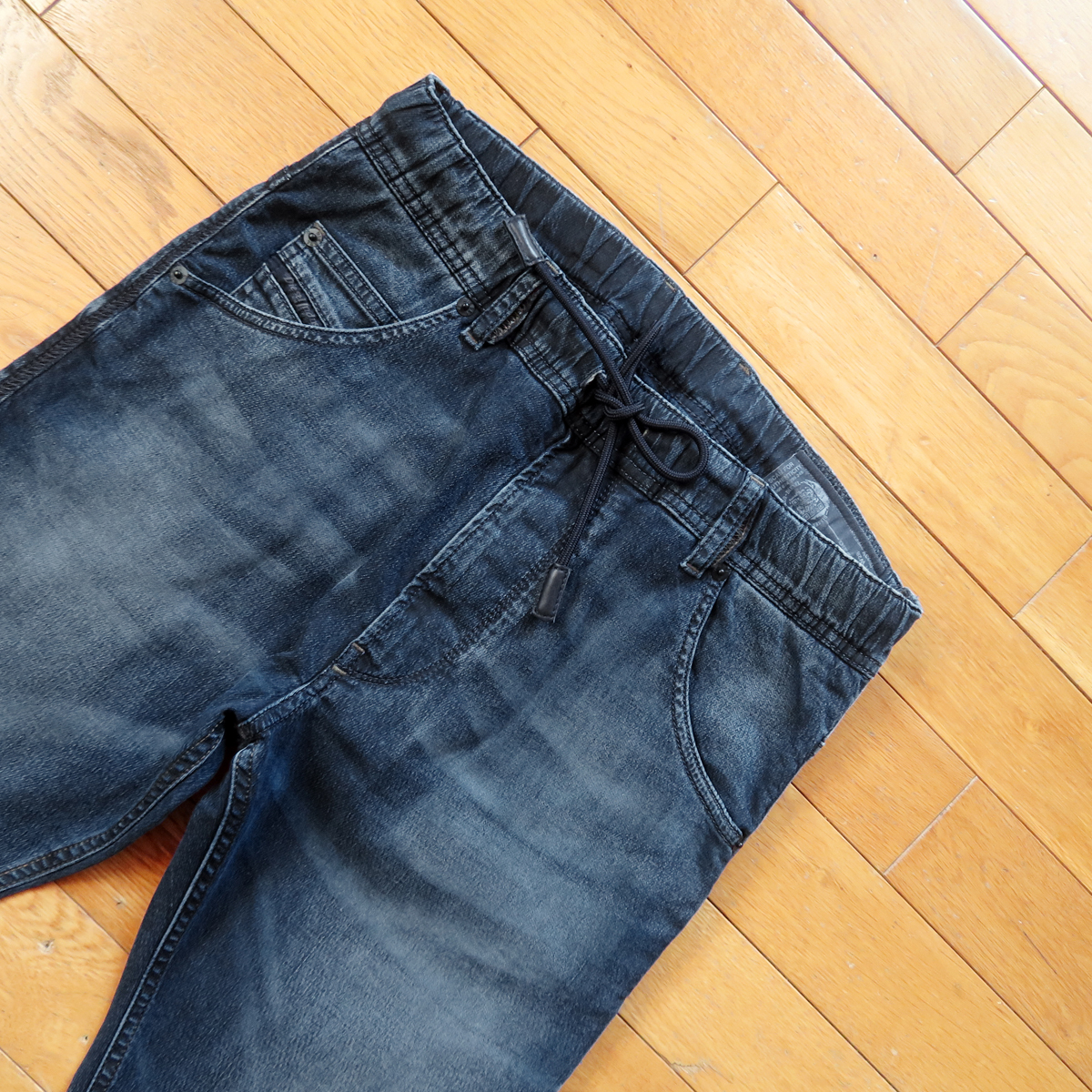 ディーゼル人気のジョグデニムで、スウェット素材をデニム生地のように丹念に織ることによって デニムパンツとしてのルックスを保ちつつ、スウェットの着用感を実現している、とても柔らかくて履きやすいデニムです。 形は、「Krooley R-NE」、スキニーよりわずかにゆとりがあり、少しリラックス感もある 人気のスリムテーパードレッグスタイルをベースに、美しいシルエットを実現しています。 ダメージ加工は、ないタイプで、色落ちの加工がすごくきれいに表現されているデニムになります。 ウエストのドローコードも、リラックス感がプラスされ、良い雰囲気になっています。 右側は、同じモデルの写真です。シルエットなど参考にしてみてください。 色はインディゴブルーです。 ジョグジーンズ(スウェットデニム)は何本かもっていますが、あまりにも柔らかくて履きやすく カジュアル通勤、公園、自転車、車の運転や旅行などにも大変重宝します。 1本持っていると本当に便利です。普通のデニムに戻れなくなるほどです。 おすすめです!いかがですか。 【コンディション】 多少の使用感はありますが、着用もわずかで、大きなダメージ、目立つ汚れ等はありません。 まずまずキレイかと思います。十分着用していただけます。 --------------------------------------------------------------------- 【モデル】 Krooley R-NE 【表記】 サイズ W28 【実寸】 平置き ウエスト 38.5cm×2(77cm)(平置き後ろ直線測定)(ゴム仕様で多少伸びます) 股上 27.5cm 股下 75cm 裾幅 16cm もも幅 23.5cm (股下付け根より10cm程下を水平に計測) 前後程度になります。※平置き、素人採寸になりますので、多少の誤差はお許し下さい。 ------------------------------------------------------------------- 【素材】 綿45% リヨセル52% ポリウレタン3% 【色】 インディゴブルー 【フロント】 ジッパーフライ ドローストリング 【USED品】 ----------------------------------------------- ◆ 他にもいろいろデニムなど出品していますので、よかったら見ていってください。 ◆ もちろん同梱もできますので、お気軽にご質問ください。 ◆ 気持ちの良いお取引を目指していますので、ご質問は事前にお気軽にどうぞ。 終了直前だとお答えできない場合があります。どうぞよろしくお願い致します。 | ||||