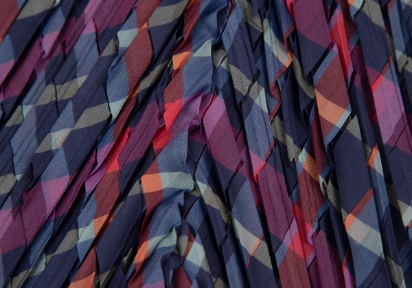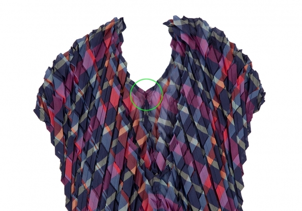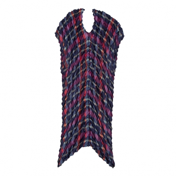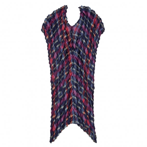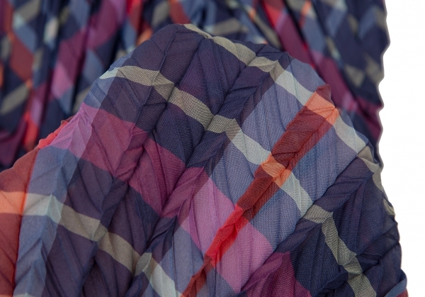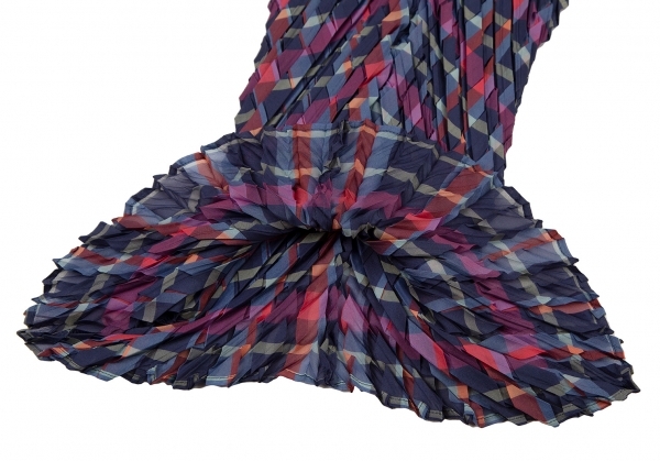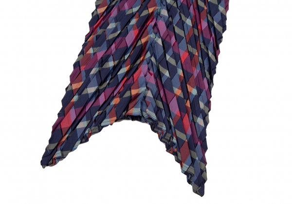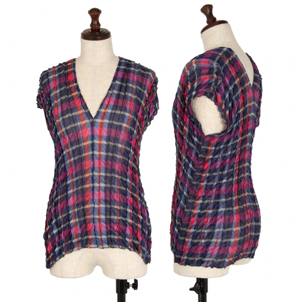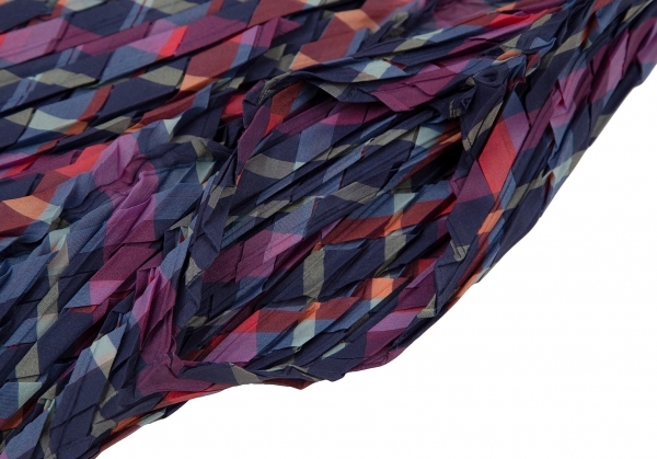 | イッセイミヤケISSEY MIYAKE 矢絣プリーツチェックプリントトップス 紺マルチM位 |