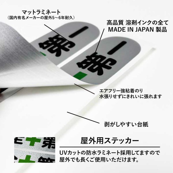 ●耐水・耐候性の高い国産ヘアラインシートをベースに、溶剤インク印刷・UVカット・マットラミネート加工しております。