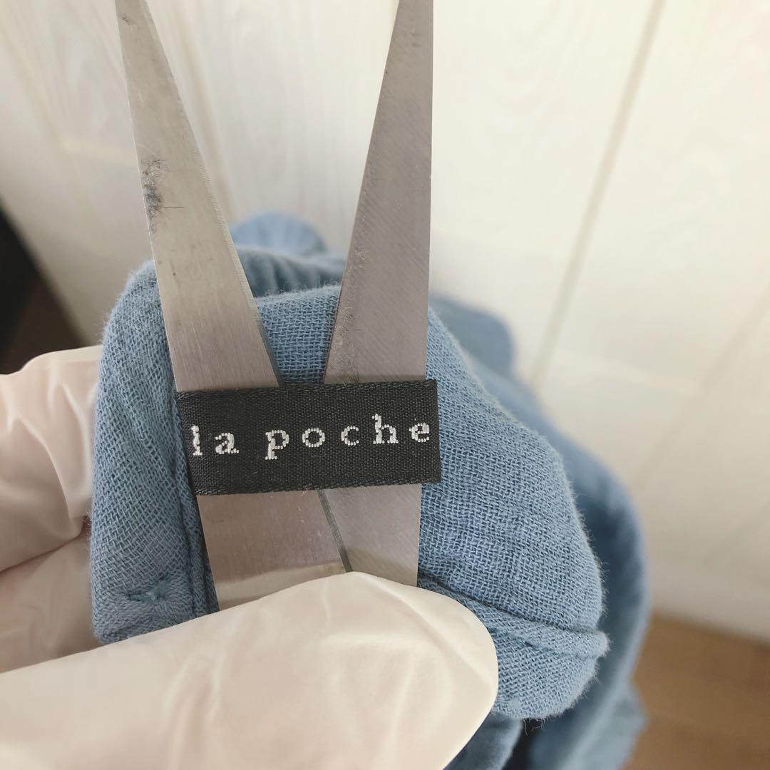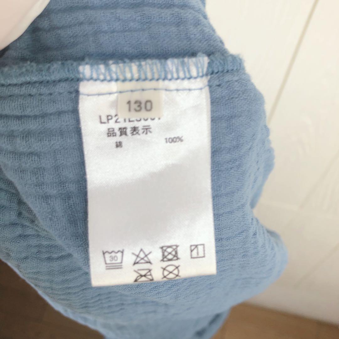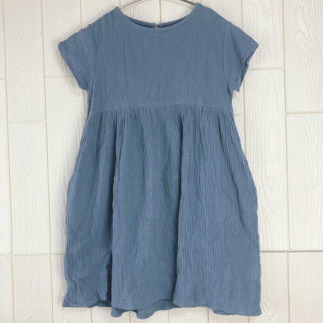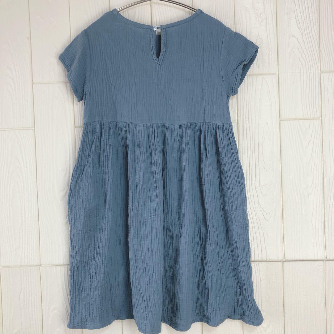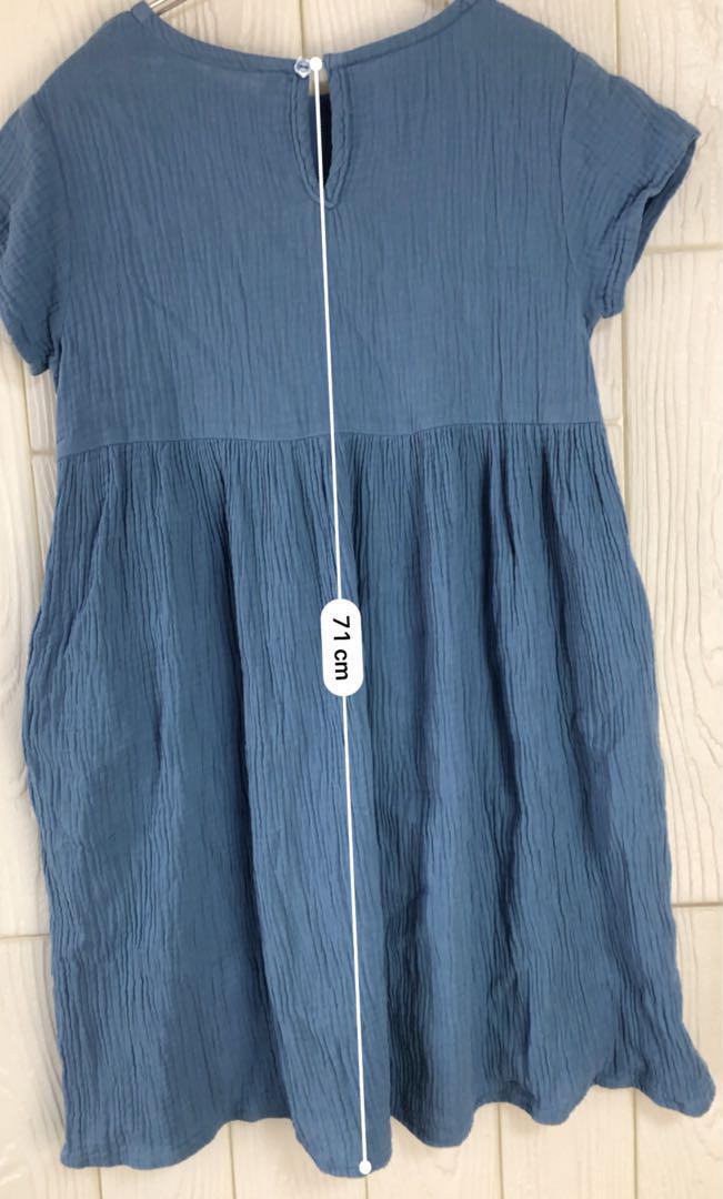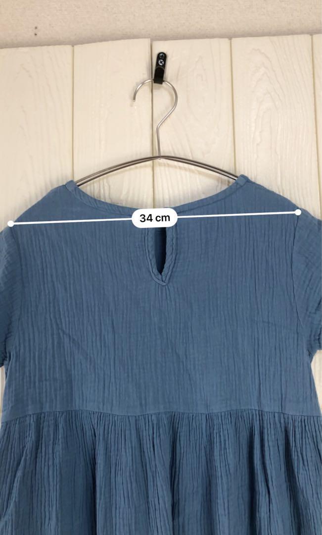 柔らかい素材の青い半袖ワンピース、34cmの肩幅と77cmの着丈。