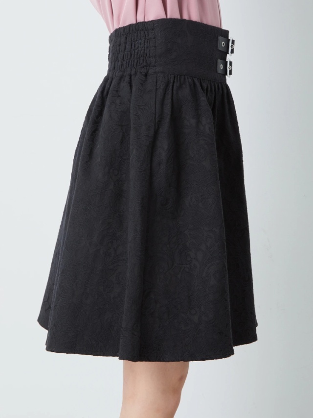 その他特記『合皮ベルトがアクセントになって、甘辛MIXなスタイリングを叶えるスカートの登場です♪ ウエストにギャザーをたっぷりとONし、ふんわりと広がるスカートラインで、女の子らしいシルエットをメイク◎ 生地には、花柄が織り込まれ、表情豊かなルックスをGETします。トップスINで、スカートが主役のスタイリングがオススメです☆