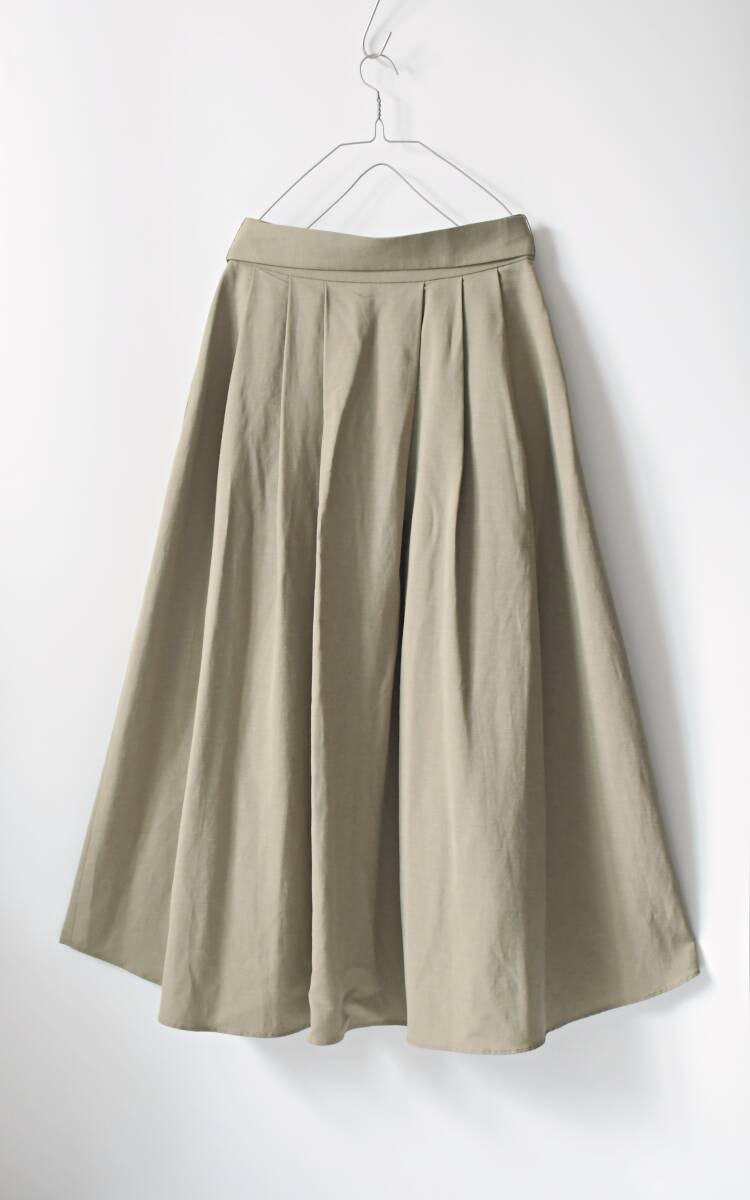 ウエストにたっぷりとタックを入れた、ボリューミーすぎないきれいなシルエットに仕上がっています。