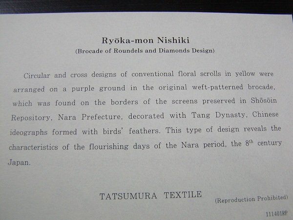 ■茶道具 出帛紗/出袱紗(だしふくさ) 裂地:「 稜華文錦 」 (りょうかもん にしき) 正絹 名物裂 京都 龍村美術織物 |