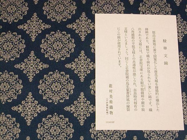 古代裂 復元の 第一人者として広く知られた 初代 龍村平藏の創業に始まった 龍村美術織物。 染織工芸に対する功績により 「芸術院恩賜賞」 受賞。 |