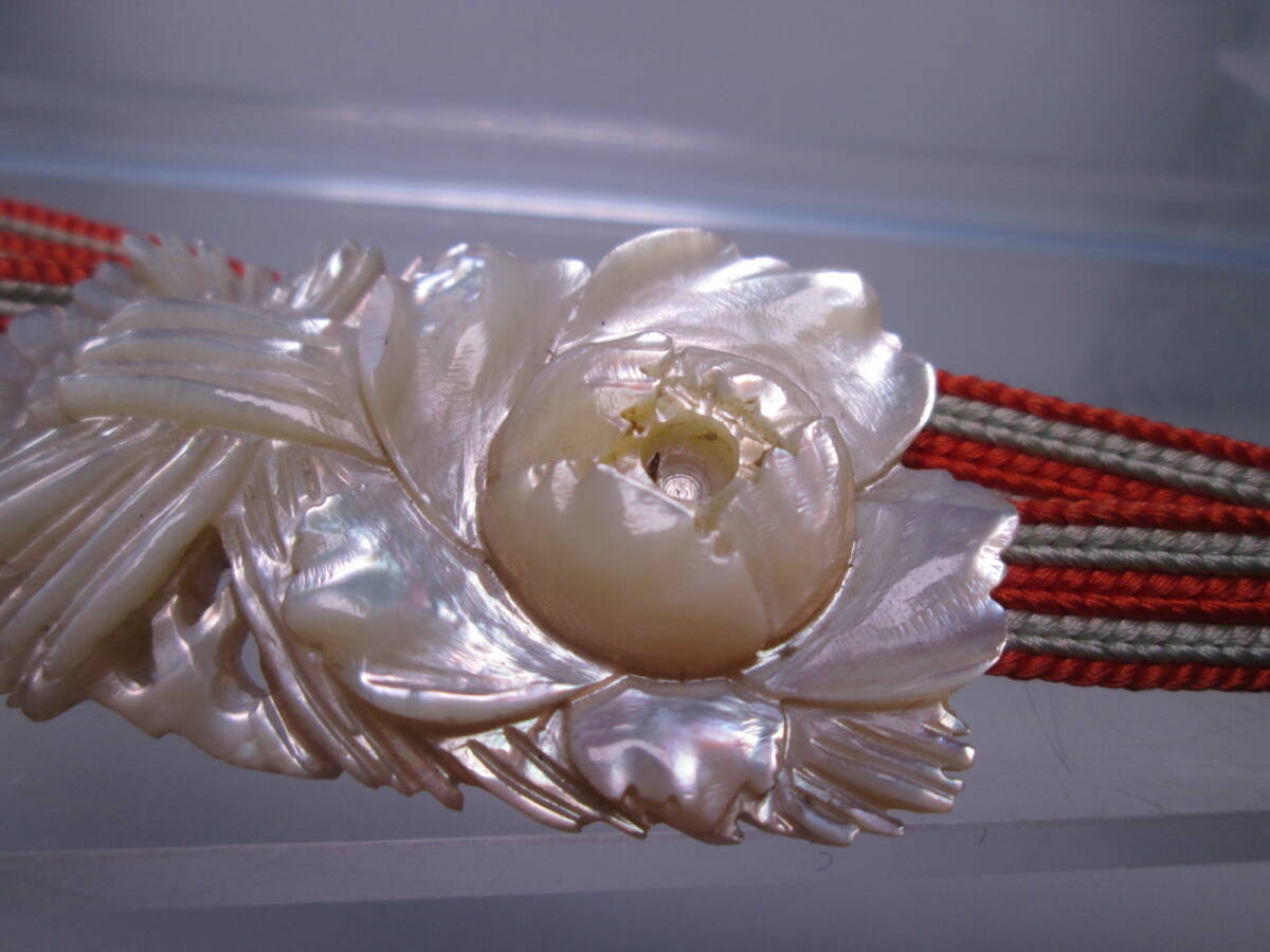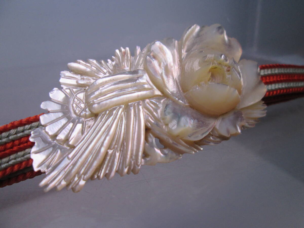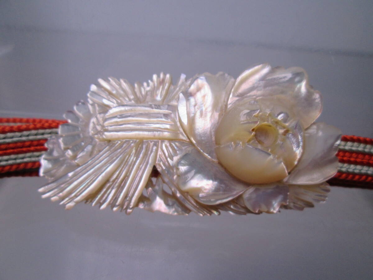 【江月】アンティーク・シェル細工 牡丹に菊花彫刻の帯留め マザーオブパール