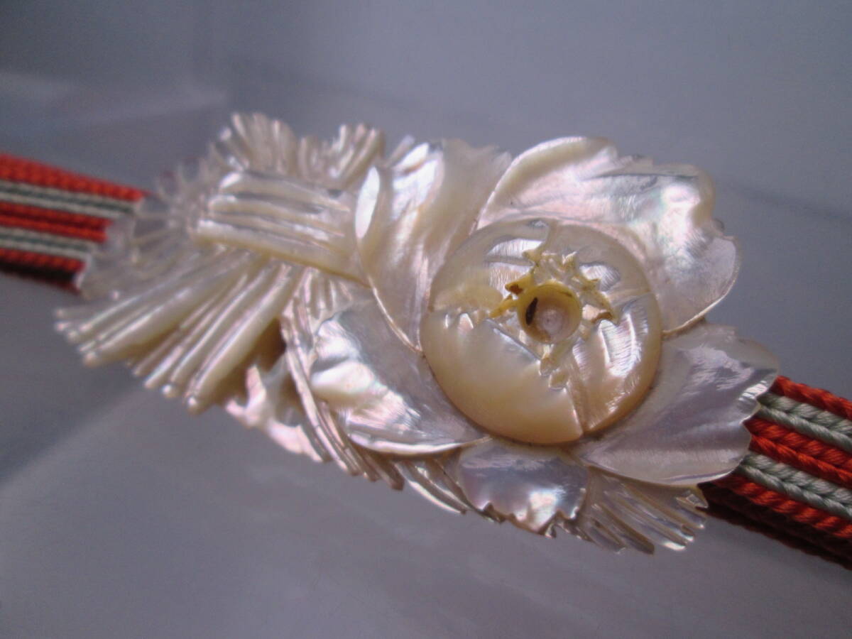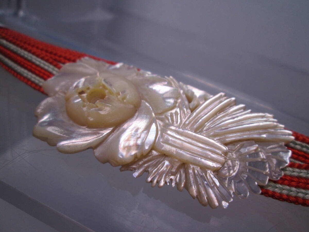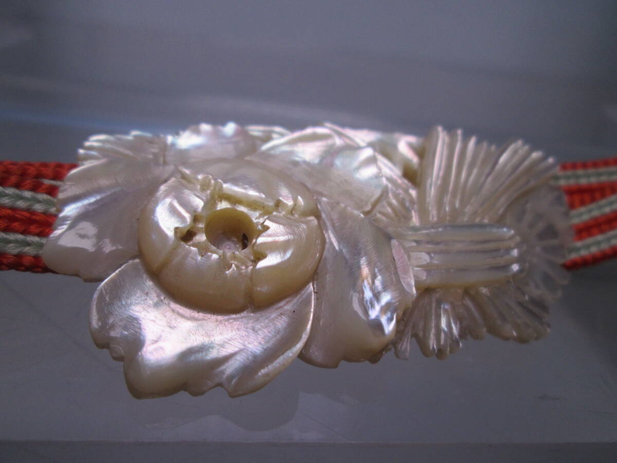 【江月】アンティーク・シェル細工 牡丹に菊花彫刻の帯留め マザーオブパール