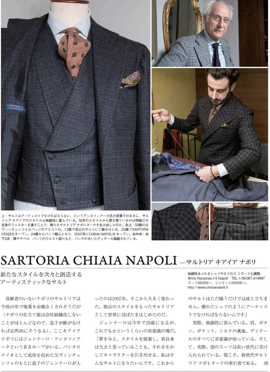 日本国内では正規には未流通なため知る人はまだ少なく、仕立て屋が多く集まるナポリの「キアイア通り」の一角に優雅なサロンを構えています。説明は画像をご覧ください。