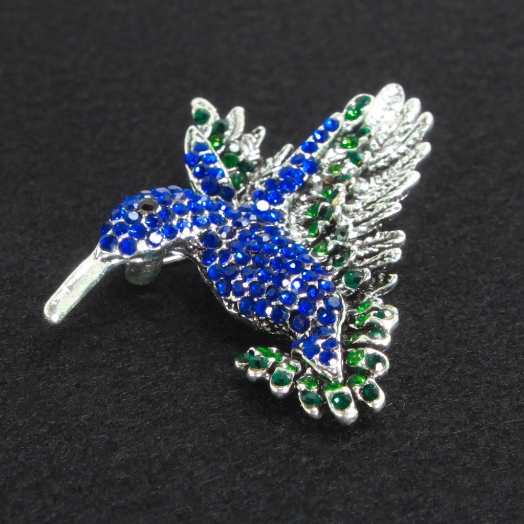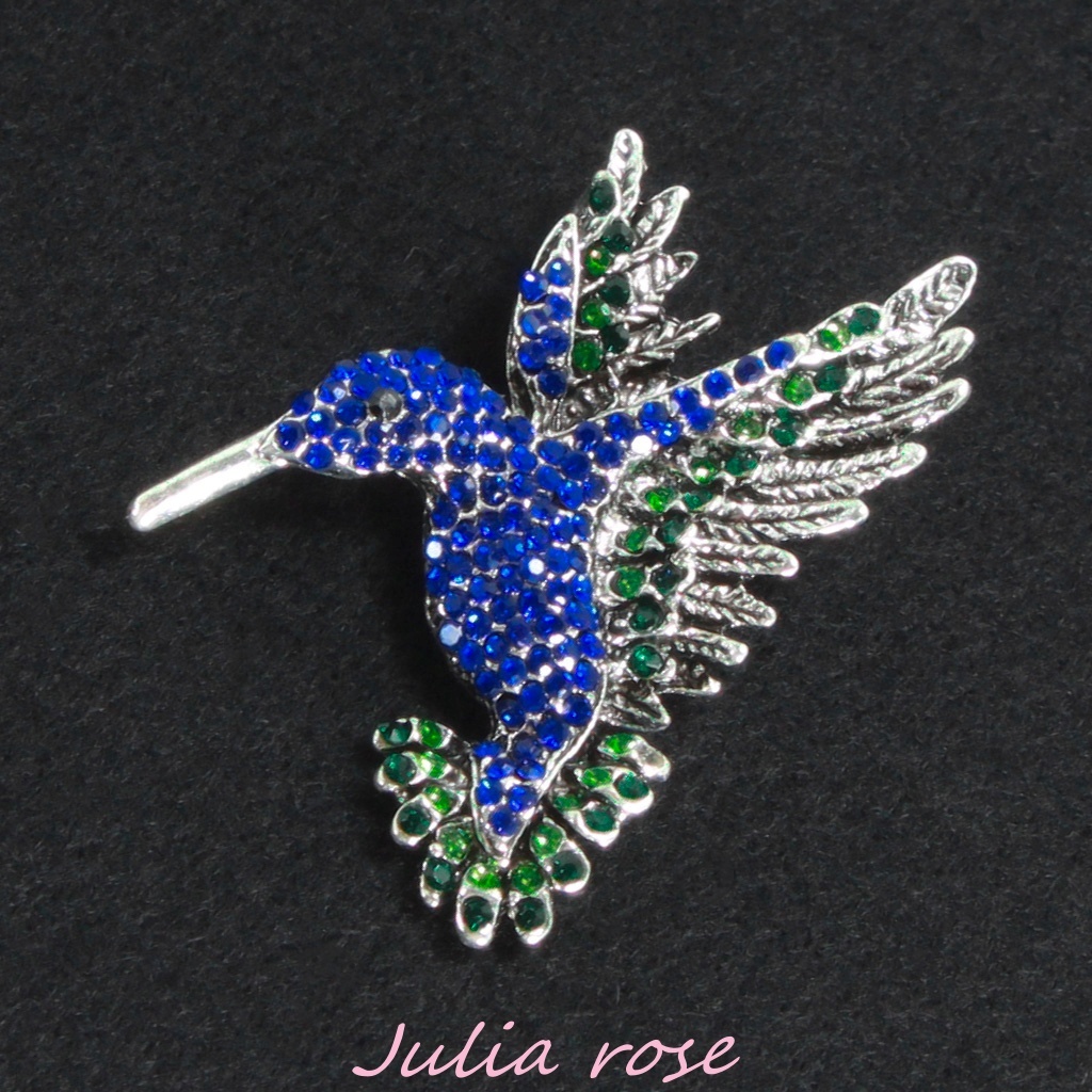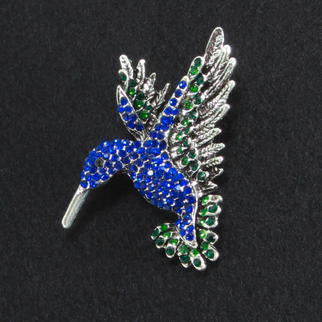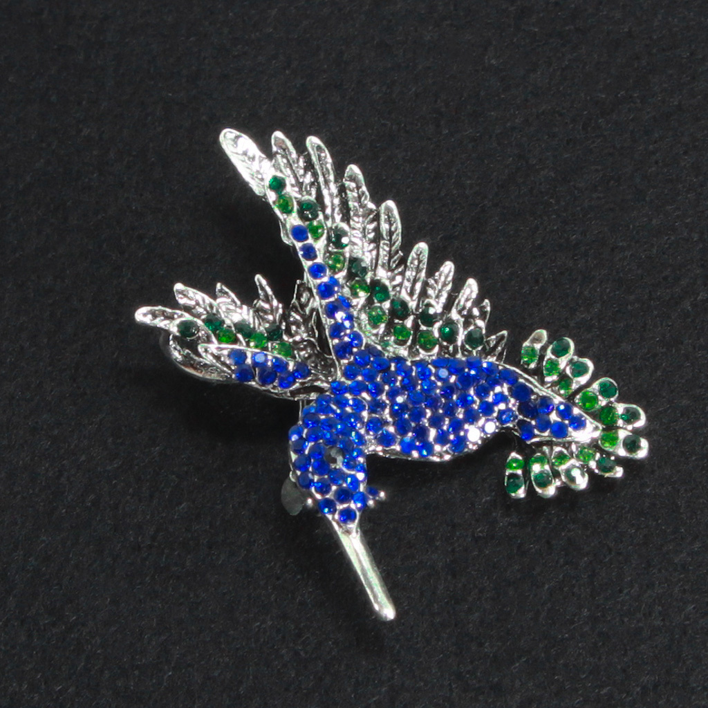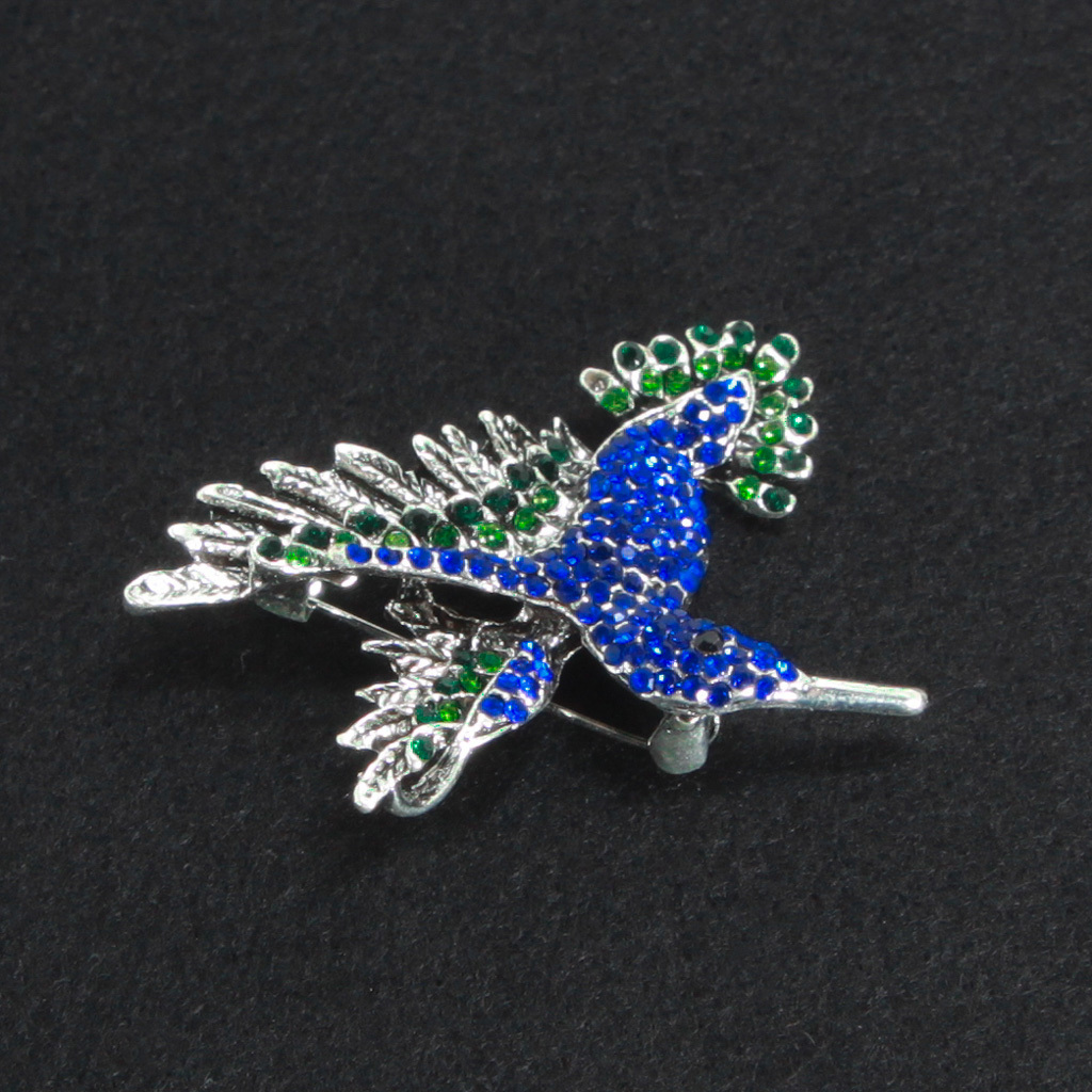 藍色のハチドリのようなブローチ 藍色とグリーンを中心としたラインストーン 藍色の鳥