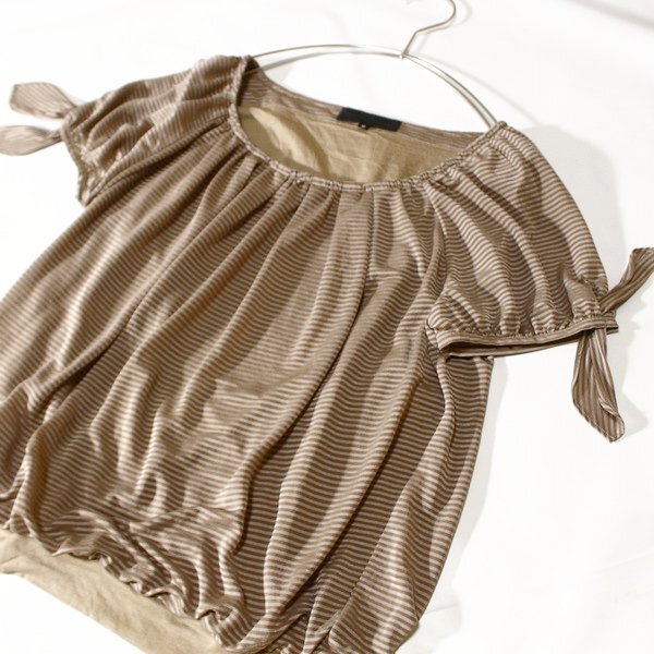 可愛いボーダー柄の袖リボン・ストレッチカットソーです。