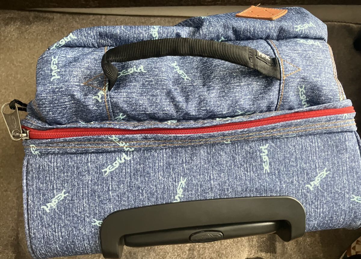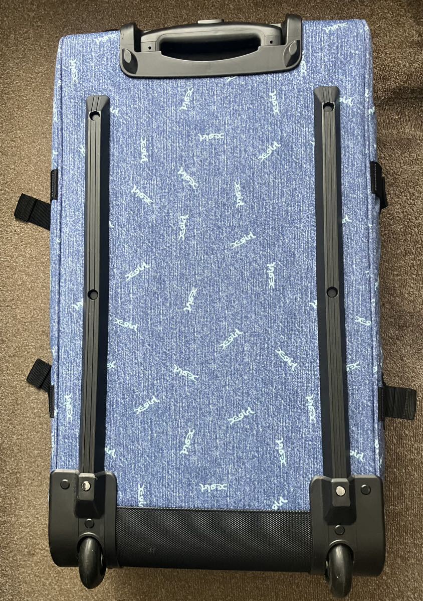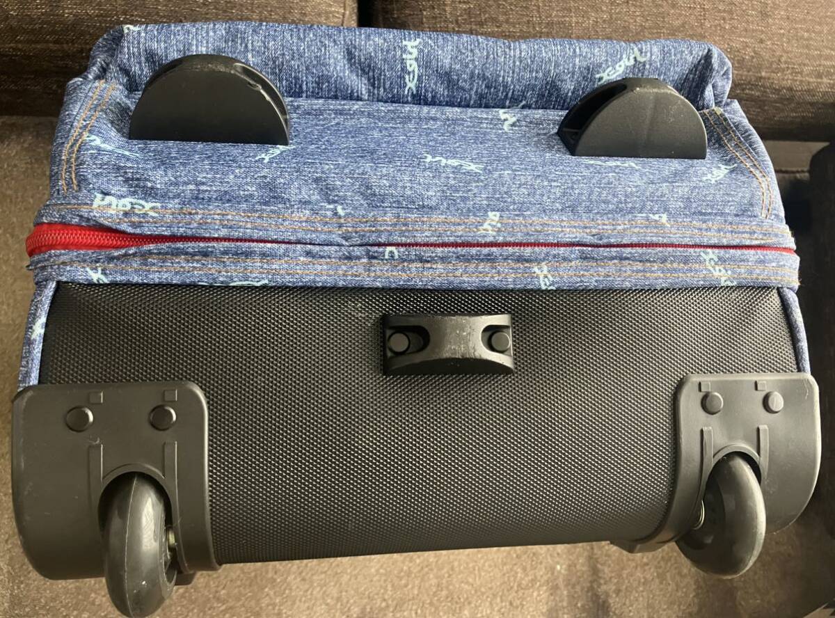 リアルなデニム柄には抜染されたようなロゴの総柄を配置し、デニムパンツをイメージしたベージュの皮ワッペンがとてもかわいいキャリーバッグ、スーツケースです。