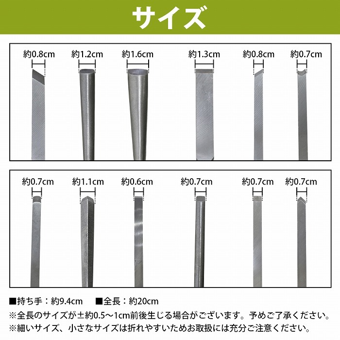 平刀・丸刀・切り出し刀・三角刀等12種類のセットで、