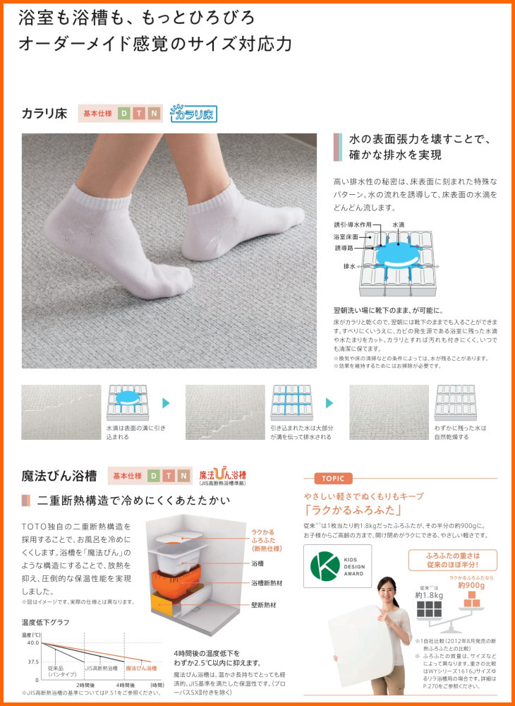 商品説明 | もっとひろがるWBシリーズ ★浴室も浴槽も、もっとひろびろ。12種類になった対応サイズ。 ★水の表面張力を壊すことで、確かな排水を実現。『カラリ床』 ★二重断熱構造の浴槽だから、帰宅が遅い日でもあったかいまま。『魔法びん浴槽』 ★くるっとふける形状 『新まゆ形浴槽』 ★はっ水・はつ油技術で水も皮脂も弾き、汚れが付いてもお掃除簡単。 『お掃除ラクラク人大浴槽』(全シリーズオプション) ★炭素の膜で、水あかのこびり付きを抑えます。 『お掃除ラクラク鏡』(Nシリーズオプション) ★ほこりやカビが付きにくく、お掃除がラクになる『スッキリドア』 ★排水口のお掃除が簡単。すみずみまできれいに。 『お掃除ラクラク排水口』『らくポイヘアキャッチャー』 ※商品の詳細につきましてはメーカーHP・カタログでご確認願います。 ◆本タイプ以外の型・サイズもございます。 ◆ユニットバスの他、システムキッチン・洗面化粧台・トイレ等の水廻り商品も取り扱って おります。 ◆オプション等で別途お見積りが必要なケースのお問い合わせは、TEL・FAX・メールにて お気軽にどうぞ! ◆メーカーの定価見積書からもお買い求め頂けます。 事前にご連絡の上、FAXまたはメールにてお送り下さい。 弊社価格の見積書を作成致します。 ◆サイズ違い等、ショップ上に掲載されていない商品をご希望の方はお問い合わせ下さい。 ⇒ クリックで”WEBカタログ”にリンクします |