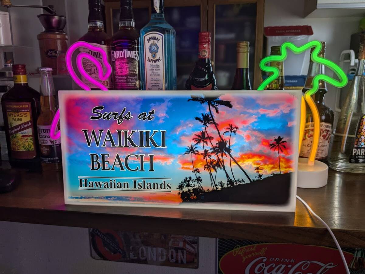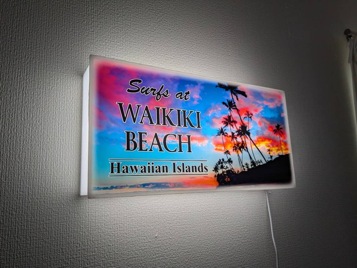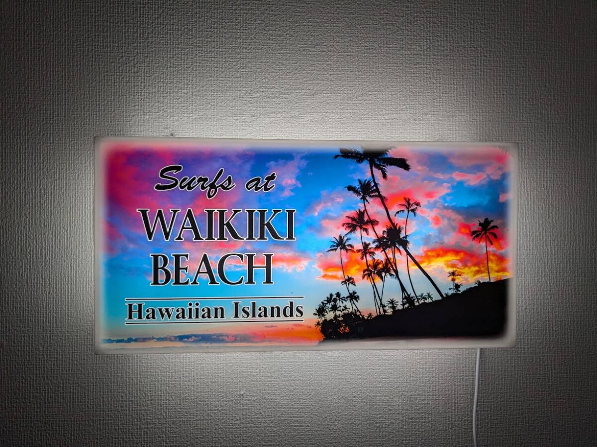 ★画鋲で壁に簡単設置★ 店舗、自宅、ガレージ、オフィスの窓際・カウンター・棚・テーブルやちょっとしたスペース、車内・キッチンカー・屋台・イベント・パーティーなどに 【夕焼け ハワイ 南国ビーチ】電飾看板Lサイズです★ 勿論、置物としても◎ オーダー無料、プレゼントにも大変好評頂いております★ ◆サイズ◆20センチ×40センチ×奥行き7センチ ◆材質◆本体(アクリルプラスチック製)・表示面(IJバックライト発光フィルム貼り) ◆電源◆USB供給電源(家庭用コンセントコネクタ付き) 〇他サイズ〇 ●Mサイズ 150mm×300mm ●LLサイズ 300mm×600mm ●3Lサイズ 400mm×800mm ●4Lサイズ 500mm×1000mm ◆オリジナルデザイン・オーダーも承っておりますので、お気軽にお問い合わせください。 自社製造製品 店舗 自宅 キッチンカー フードトラック 屋台 パーティー イベント サイン ランプ ライト 照明 看板 インテリア雑貨 置物 雑貨 テーブル カウンター 電飾看板 電光看板 光源の種類...LED