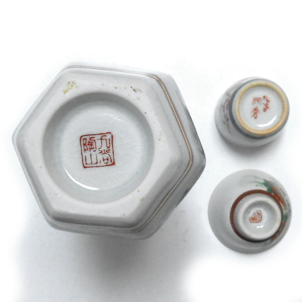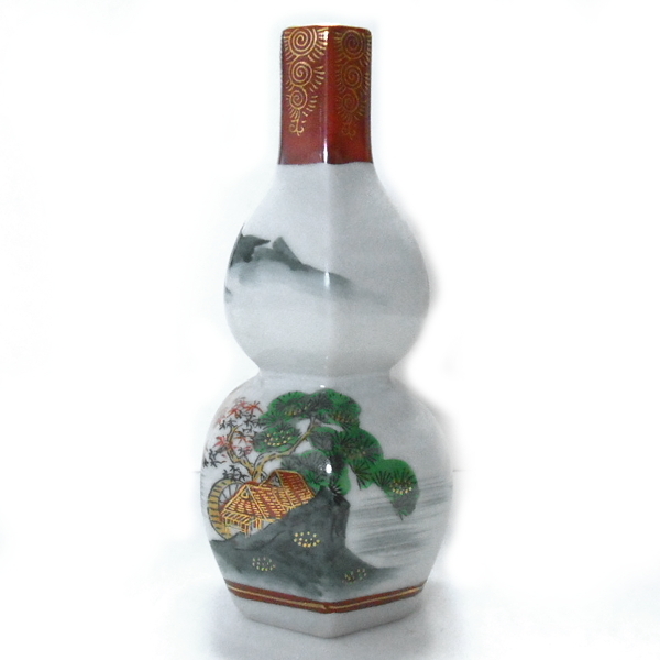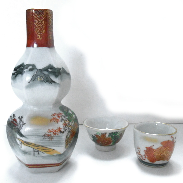 ご覧いただきありがとうございます。当商品は、九谷焼 陶山 六角瓢型徳利 山水文様 盃 陶香等 花文様 2種セットです。大きさは、徳利が直径約8.4cm×高さ約17.4cm。底径が約4.8cm。陶香が直径約4.6cm×高さ約4.3cm。底径が約3.3cm。花文様が直径約5.9cm×高さ約3.5cm。底径が約2.7cmです。080805R