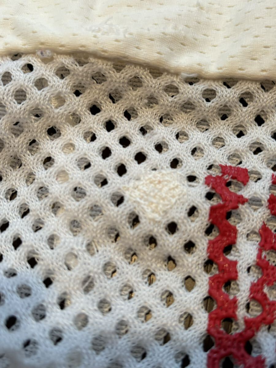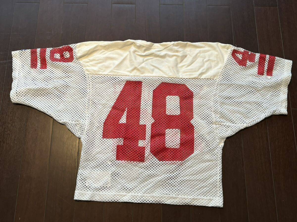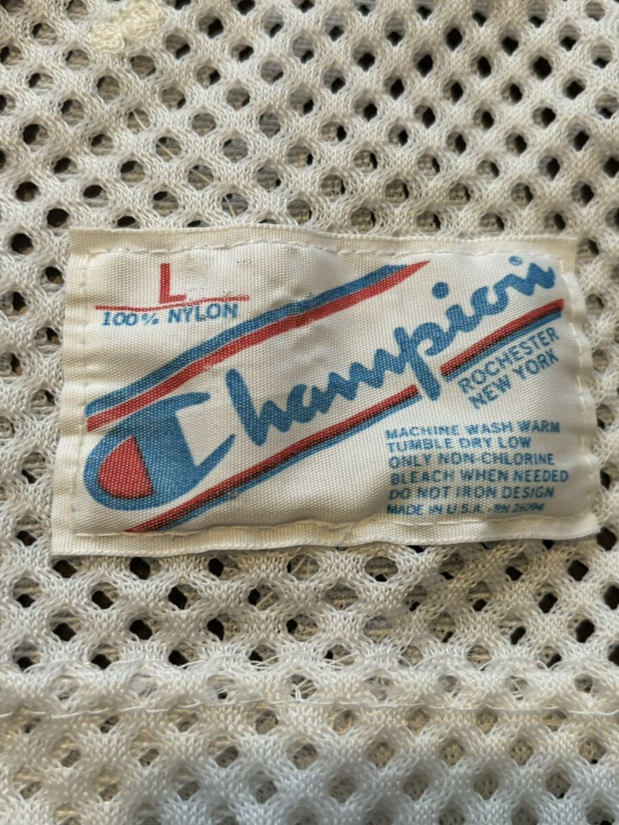 1980年代のヴィンテージのチャンピオンのゲームシャツです。メッシュになっているのでインナーを見せるレイヤードができてオシャレです。袖回り脇周りがゆったりしたカッティングで凝ったつくりで白×赤のプリントのバランスもかなり恰好いいと思います。方や見頃に入ったミシンでの直し跡もボロイ感じが逆にいい雰囲気で合わせ方によってはポイントになると思います。欲しい方は是非!