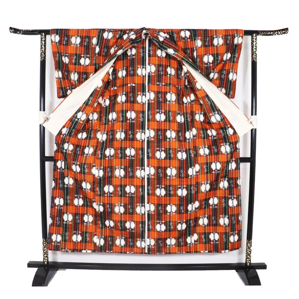 | 寸法 | 身丈:約157cm(肩袖付け上から裾までの採寸) 身丈:約153cm(背筋後襟下より裾までの採寸) 裄丈:約63cm(裄は約2cm出ると思います) 袖丈:約48cm 袖幅:約32.5cm 後幅:約28.5cm 前幅:約23cm 両肩の縫い代約5cmずつあります。 適応身長約148~156cm (実寸で採寸していますが多少の測り間違いはご了承下さい) |