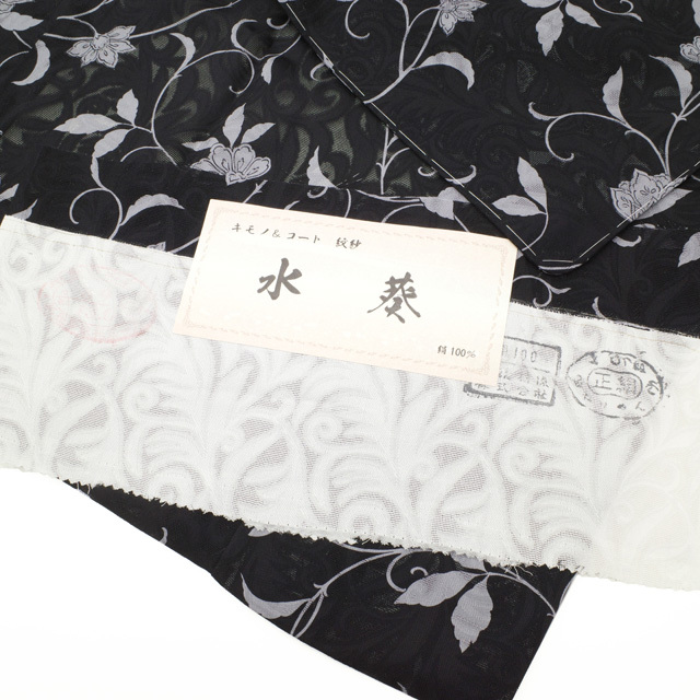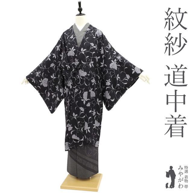 道中着 コート 単衣 紋紗 春 夏 秋 透け感 正絹 黒地 花唐草 唐花 カジュアル 新品 仕立て上がり 身丈110 裄69 Lサイズ みやがわ sb14473
