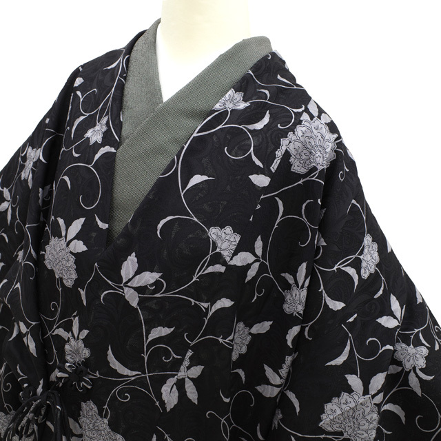 【新品】道中着 コート 単衣 紋紗 春 夏 秋 スリーシーズン 透け感 正絹 黒地 ライトグレー 花唐草 唐花 カジュアル 普段着 お出かけ 塵除け 帯隠し 美品 綺麗 販売 購入 新品 仕立て上がり 身丈110 裄69 Lサイズ みやがわ sb14473