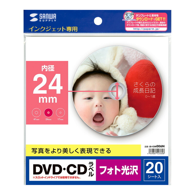 ●DVD・CDを美しく完成させるオリジナルラベルがインクジェットプリンターで手軽に作れます。広く印刷できる内径24mmタイプです。