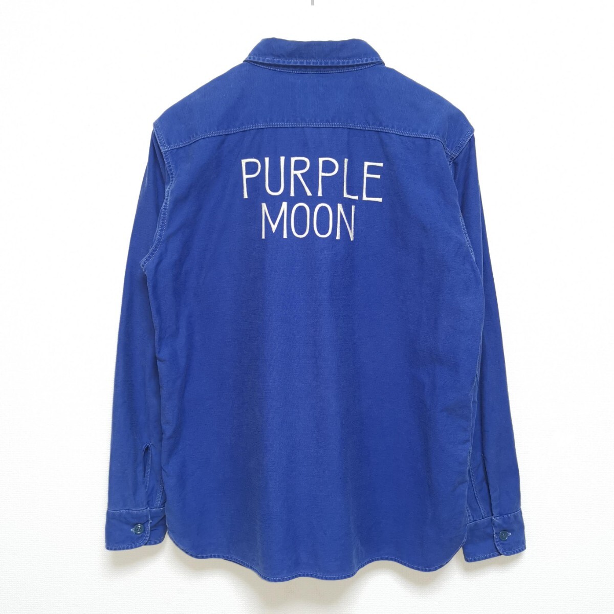 【コメント】:RADIALL FIVE EAST WORK SHIRTです。JAPAN製、ワッペン付き、バックはPURPLE MOON刺繍、ウォッシュ加工されたハリコシのあるブルーボディになります。使用感の少ない綺麗なお品です。昔のモノですので一応古着扱いでお願いします。