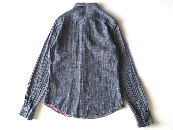 45rpmのシャツ。裏がチェックになった、コットンのダブルガーゼ生地を使用しております。インディゴのダンガリー/シャンブレーのような表情が魅力。Rのステッチのトップボタンと左裾のR刺繍がさりげないアクセントになります。上質な素材使いと綺麗なシルエットで、様々なコーディネートにお使い頂ける一着です。