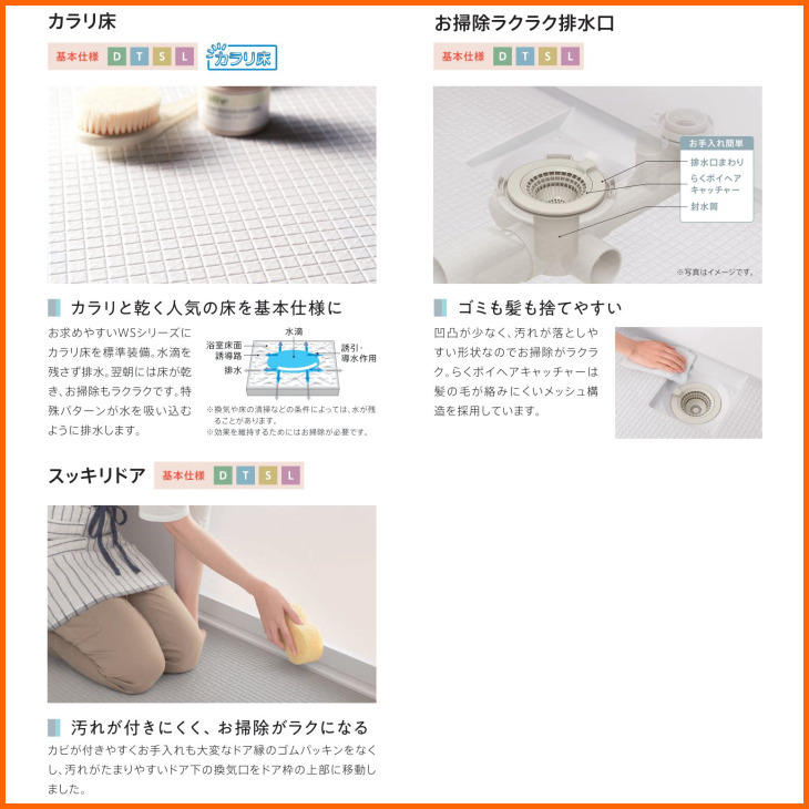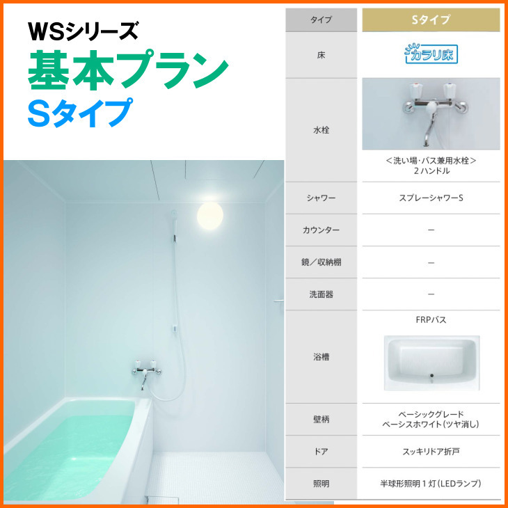 | 商品説明 | 〜WSシリーズ〜 ◆『浴槽』バスタイムをより快適に業界最長の浴槽底面で足元ゆったり ◆『カラリ床』カラリと乾く人気の床を基本仕様に ◆『お掃除ラクラク排水口』ゴミも髪も捨てやすい ◆『スッキリドア』汚れが付きにくく、お掃除がラクになる ※商品の詳細につきましてはメーカーHP・カタログでご確認願います。 ◆本タイプ以外の型・サイズもございます。 ◆ユニットバスの他、システムキッチン・洗面化粧台・トイレ等の水廻り商品も取り扱って おります。 ◆オプション等で別途お見積りが必要なケースのお問い合わせは、TEL・FAX・メールにて お気軽にどうぞ! ◆メーカーの定価見積書からもお買い求め頂けます。 事前にご連絡の上、FAXまたはメールにてお送り下さい。 弊社価格の見積書を作成致します。 ◆サイズ違い等、ショップ上に掲載されていない商品をご希望の方はお問い合わせ下さい。 ⇒ クリックで”WEBカタログ”にリンクします |