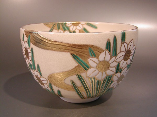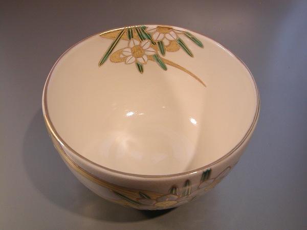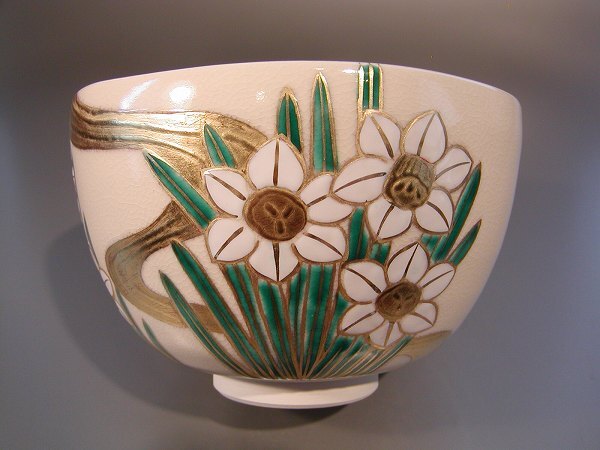 | ■茶道具・茶器 抹茶茶碗 仁清 水仙の絵、 京焼 東福窯 中村能久(よしひさ)作 | |