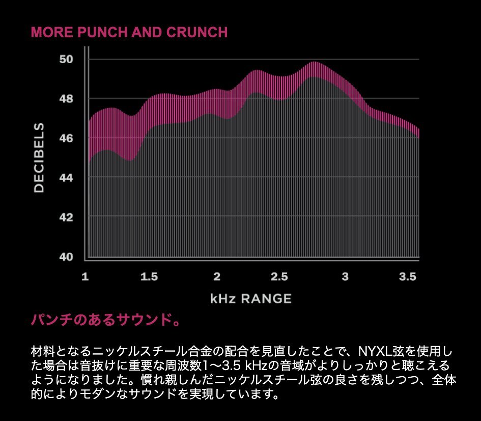 NYXLシリーズは、これまで市場に出たどの弦よりもチョーキング強度が向上、大音量かつチューニング安定性の優れた弦です。ニューヨー クに拠点を置くD'Addario社によって考案、開発、製造されたこの新しい弦は、芯線とプレーン弦に破断強度に優れた高炭 素スチール(HCS)を採用、プレイヤーにこれまでにないレベルの演奏性、安心感、パワーを提供するものとなっています。