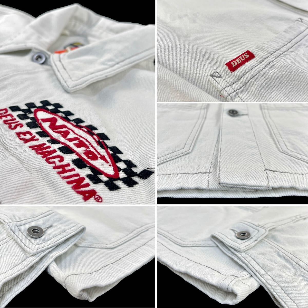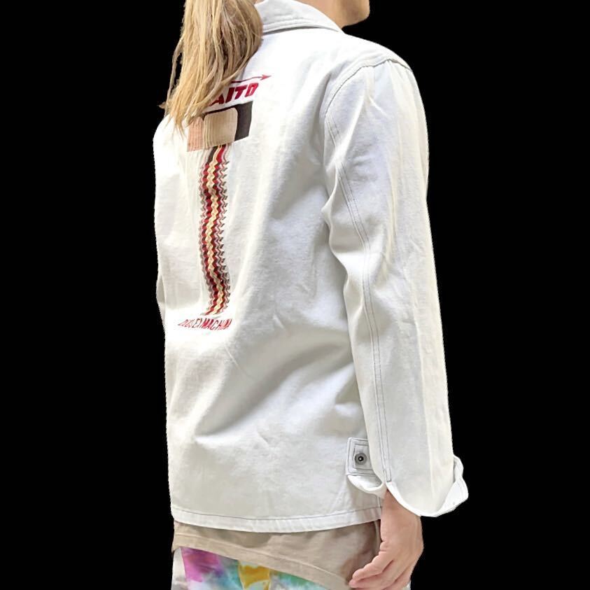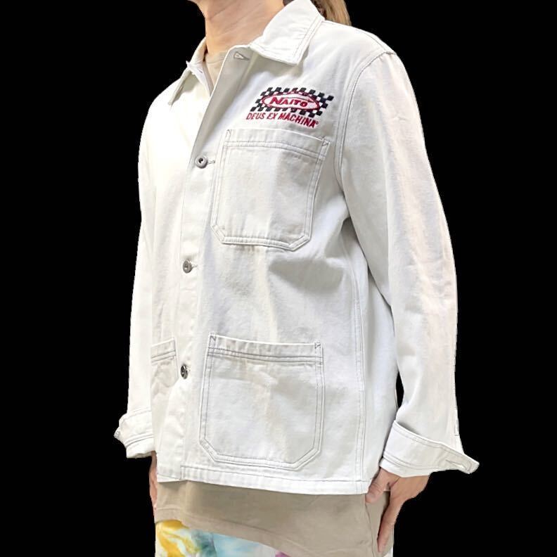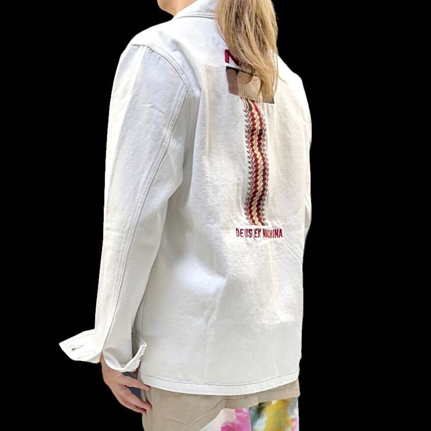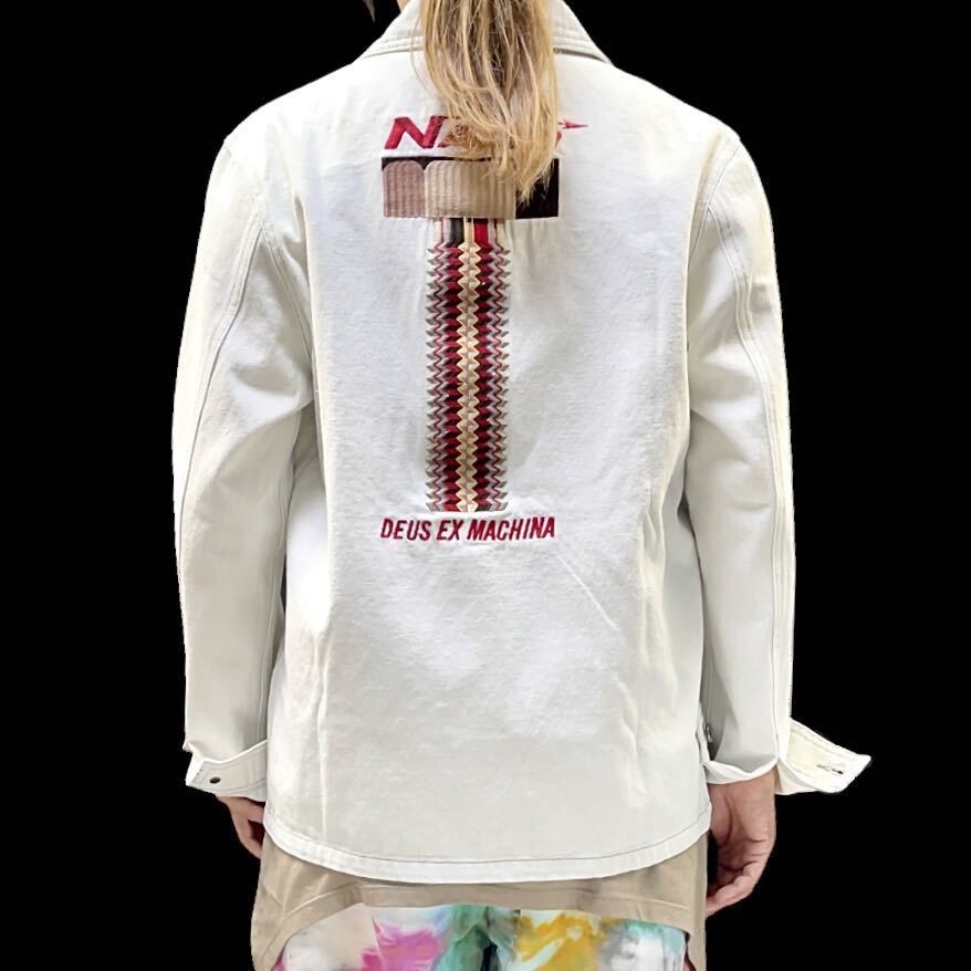 背中のポップなタッチのボルトの刺繍がDEUSらしく目を引くデザインのモーターワークテイストなカバーオールデニムジャケット。