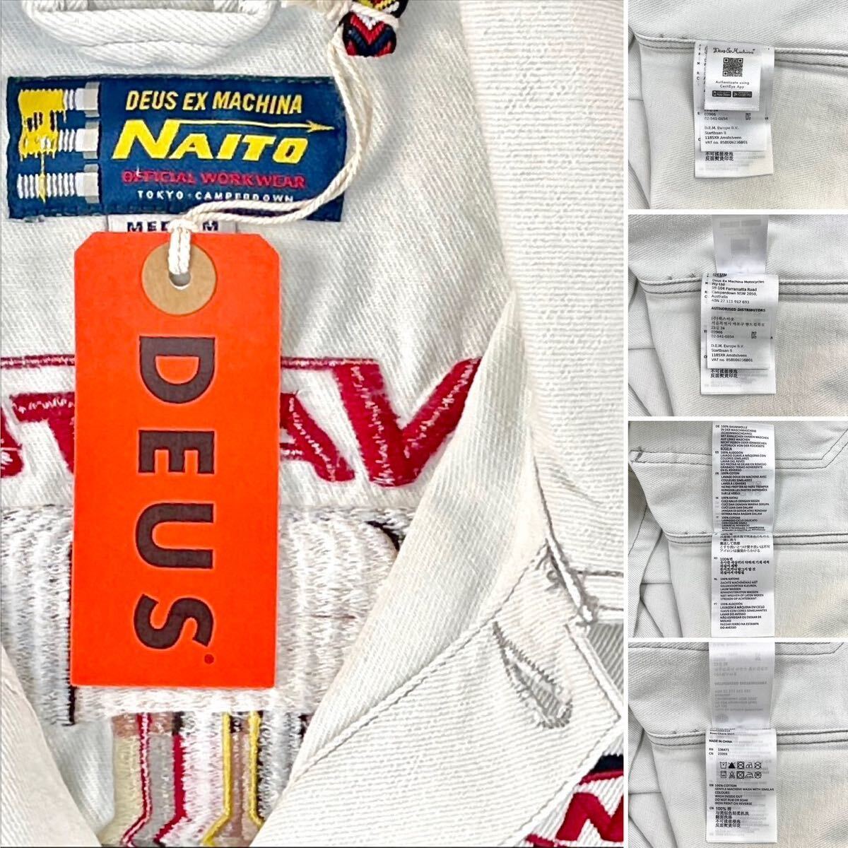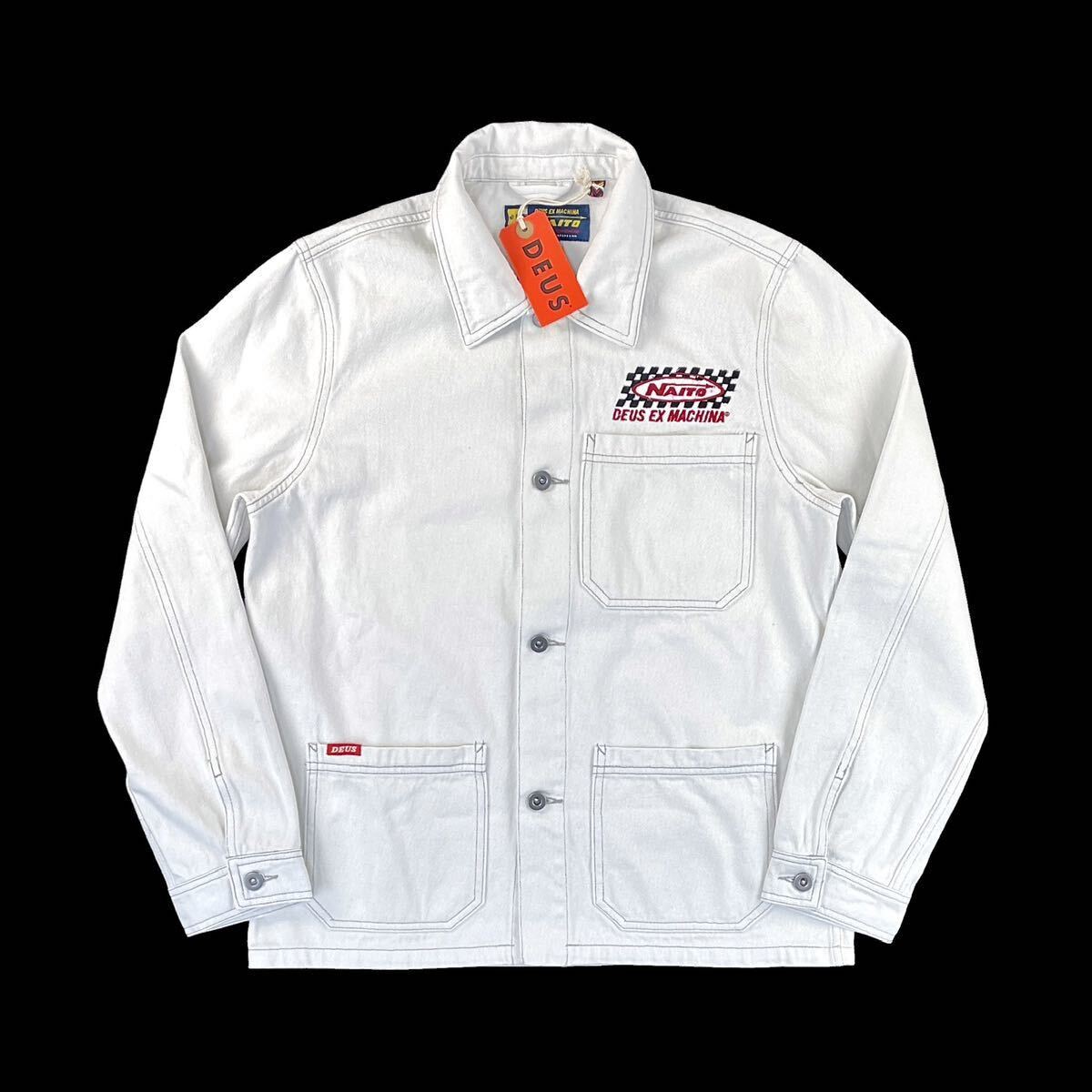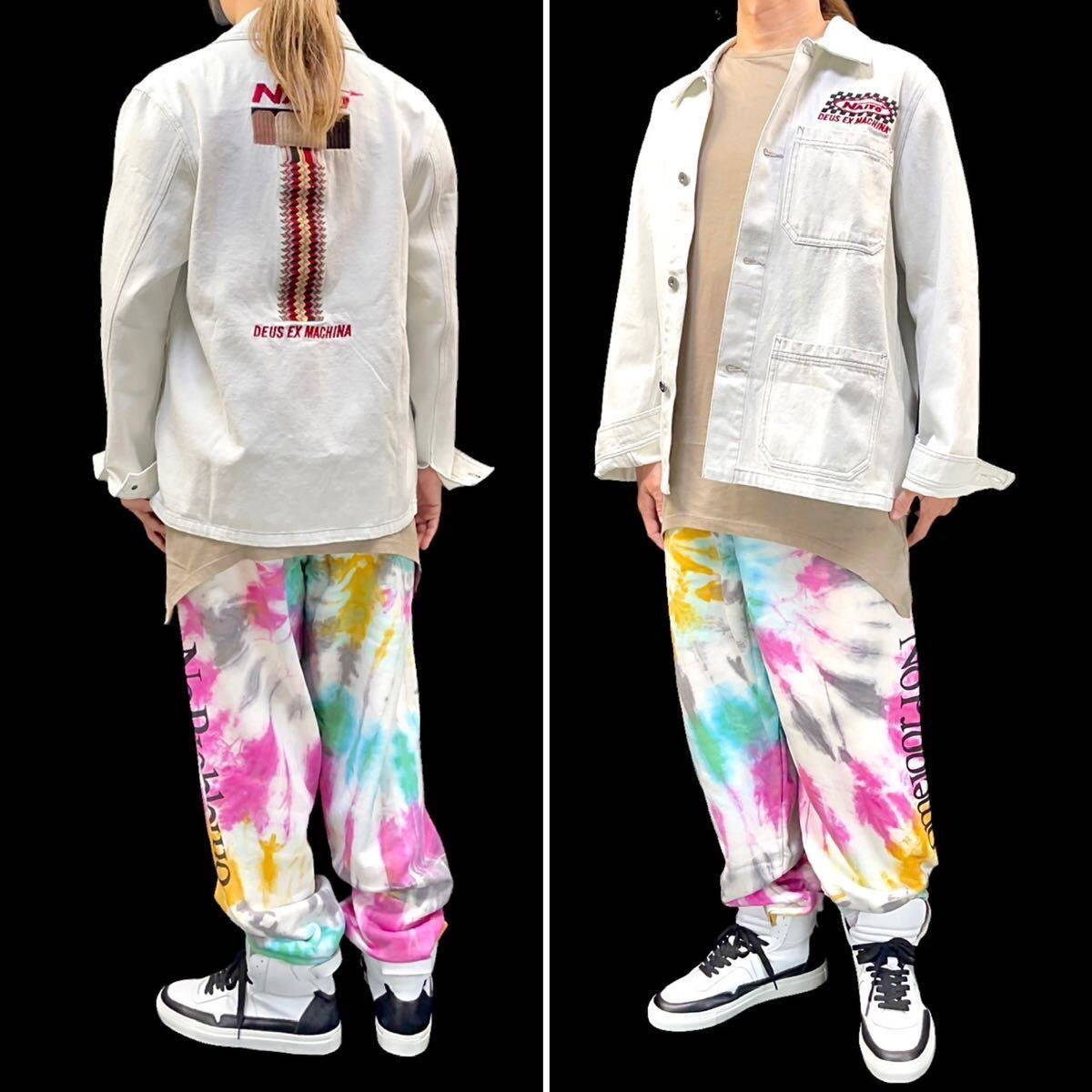 背中のポップなタッチのボルトの刺繍がDEUSらしく目を引くデザインのモーターワークテイストなカバーオールデニムジャケット。