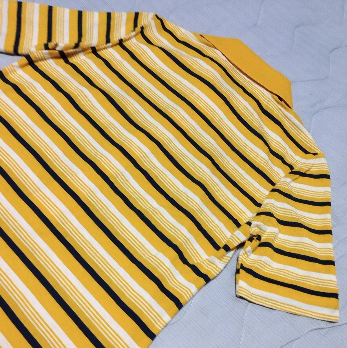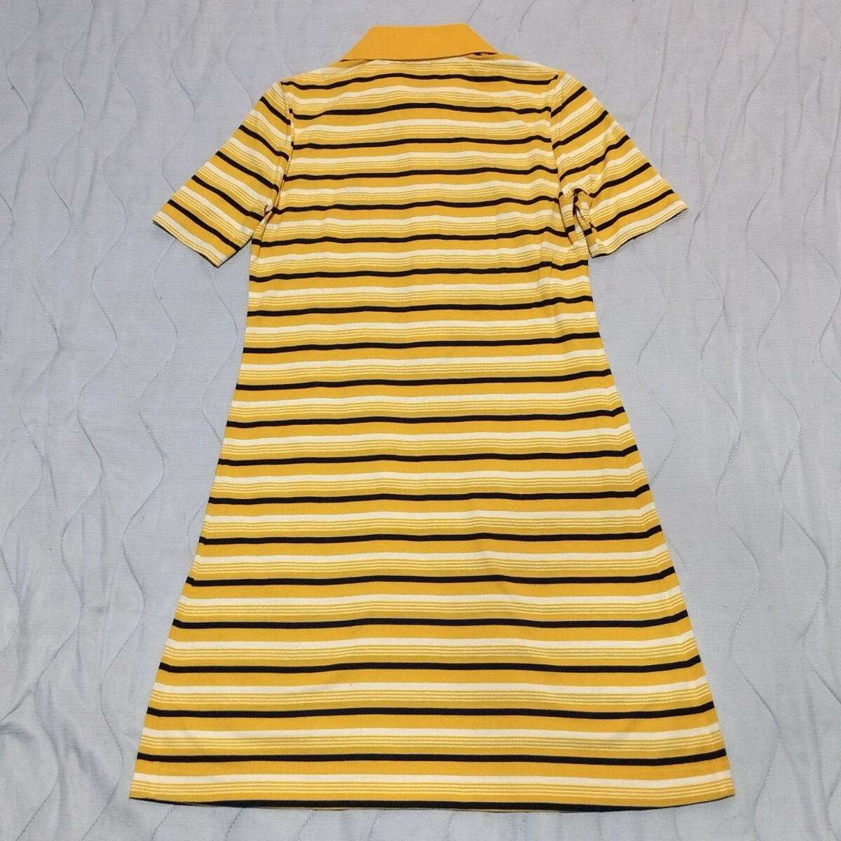 黄色ベースの白と濃紺のボーダー柄のワンピースです。