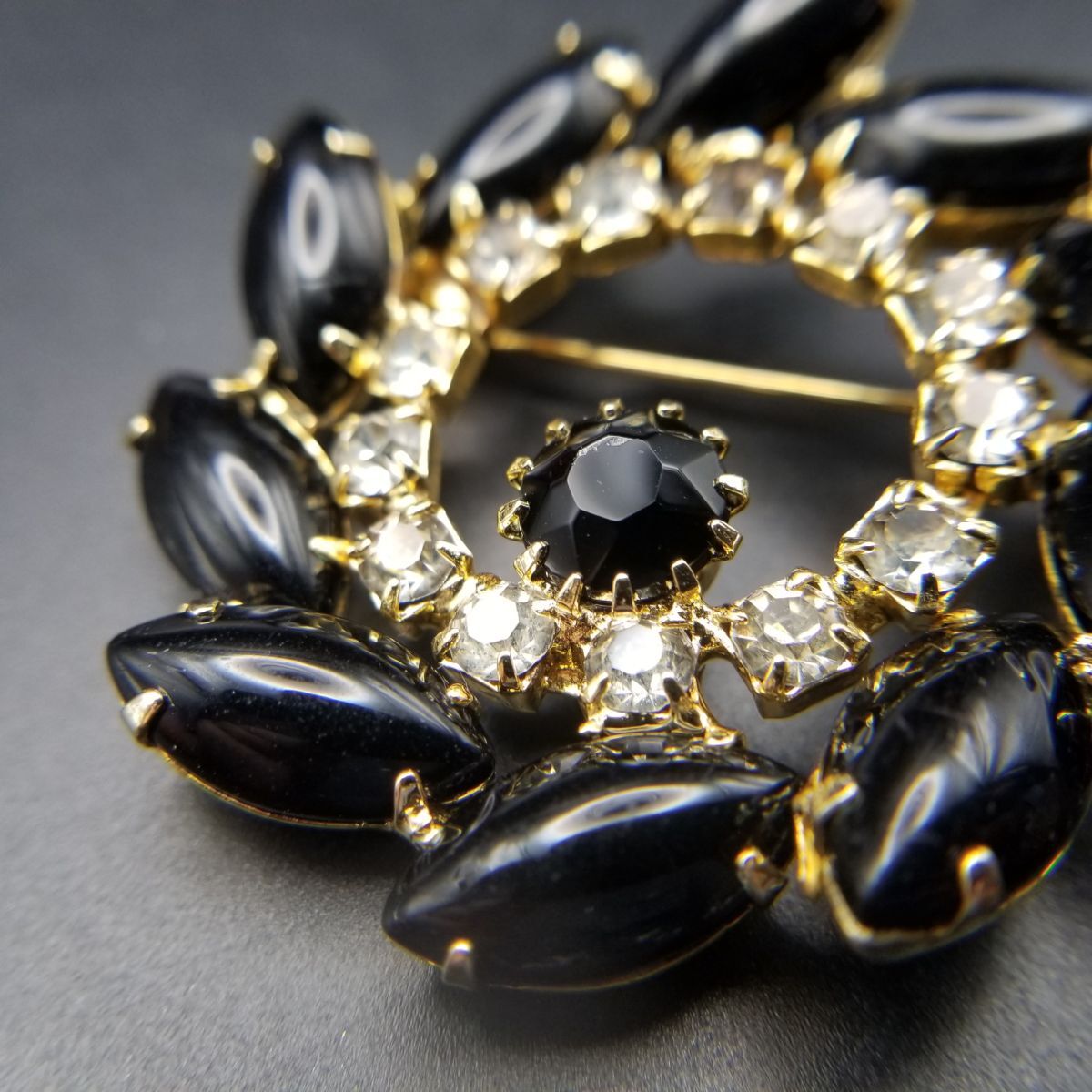 黒いカボション ラインストーン マーキスカット リース ヴィンテージ ブローチ クラシカル エレガント 上品 コスチュームジュエリー Y16-P